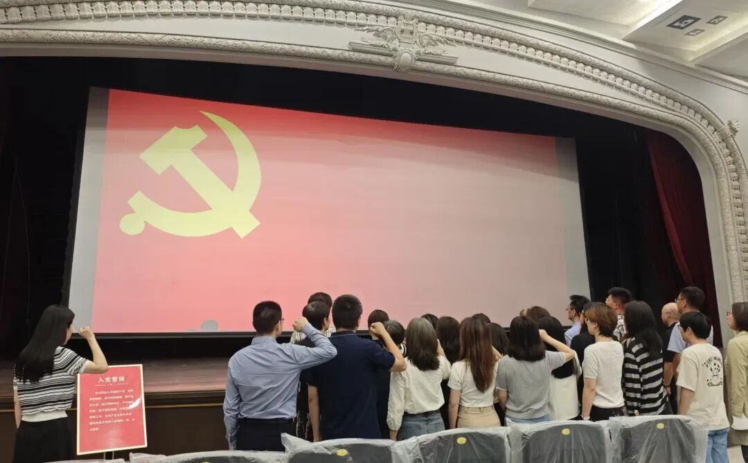 光影铸魂: 从“看电影”到“践初心” 随后,党员们走进上海大戏院,观看红色主题影片节选。银幕上的光影交织,红色经典的力量如潮水般奔涌而来。《望道》中陈望道蘸墨汁吃粽子,将信仰之甘、真理之甜诠释得淋漓尽致;《建国伟业》里,无数革命先辈为民族独立、国家新生奔走呼号、浴血奋战,宏大的历史场景再现了那段波澜壮阔的岁月,令人心潮澎湃;《红色娘子军》中,一群巾帼英雄挣脱枷锁、投身革命,她们飒爽的英姿和无畏的勇气,彰显着女性在革命浪潮中的坚韧与担当。这些经典片段的节选串烧,不仅是视觉与听觉的震撼,更似一把重锤,叩击着心灵,让我们在重温历史中,铭记初心使命,汲取奋进力量,深刻体会到今日的和平与繁荣,是无数革命先烈用热血与生命换来的,激励着我们传承红色基因,在新时代的征程上奋勇前行。 影片落幕,党员教师们面向党旗整齐列队。“我志愿加入中国共产党……”铿锵有力的入党誓词响彻影厅。党总支书记许晓芳领誓时强调:“重温誓词不是形式,而是要把誓言刻进心里、落在行动。作为教育工作者,我们的‘初心’就是为党育人、为国育才,用红色基因滋养学生成长。”