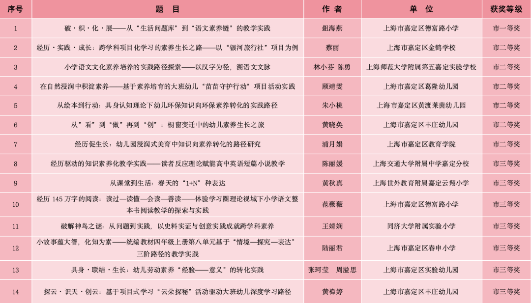 在上海市教科院普教所、《上海教育科研》编辑部、黄浦区教育局等单位联合举办的2025年“黄浦杯”长三角城市群“经历:化知识成素养”征文评选活动中,我区取得好成绩,共有14篇征文获奖。其中,一等奖1项 、二等奖6项、三等奖7项,获奖名单如下。我区德富路小学鉏海燕老师不仅以实力斩获市一等奖,更在后续平台再绽光彩——受邀代表上海获奖教师在总结交流大会上分享经验。她的发言饱含教育热忱、尽显实践智慧,赢得与会人员高度赞誉,用优秀诠释了我区教师的育人初心! (单击图片放大查看) 向获奖老师及单位表示祝贺! 供稿:郭文霞 编辑:李舒羽 审核:丁 馨