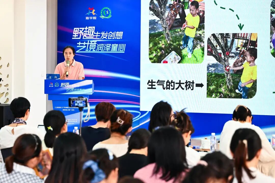 现场观摩,走进儿童艺术世界 活动伊始,与会者走进昌吉路幼儿园的“吉宝院子”,实地观摩了幼儿在“光影树林”“童话树屋”“泥巴派对”“花车巡游”“神奇小路”等户外场景中的创想艺术活动。儿童在自然环境中自由探索与创作、大胆表现与表达,展现出丰富的想象力和艺术表现力,充分体现了“野趣”中萌发的艺术活力。