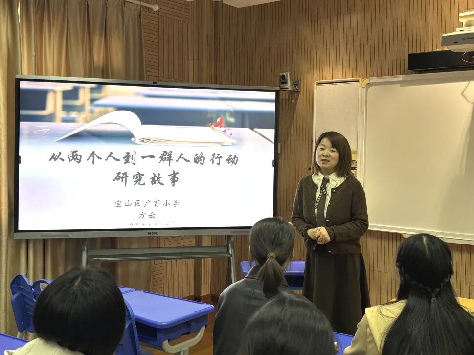 观现场洞察研究过程 宝山区广育小学科研室主任方云带领研究团队以《从两个人到一群人的行动研究故事》为题,详细讲述了学校行动研究团队从 “两人起步” 到 “跨学科协作” 的发展历程,推动青年教师在“问题中研究、在研究中实践”,提升教学效率并促进专业成长,形成可复制、可推广的研究范式。随后团队成员分别从“问题、计划、实践、数据、成果”方面展示了行动研究的整体历程。