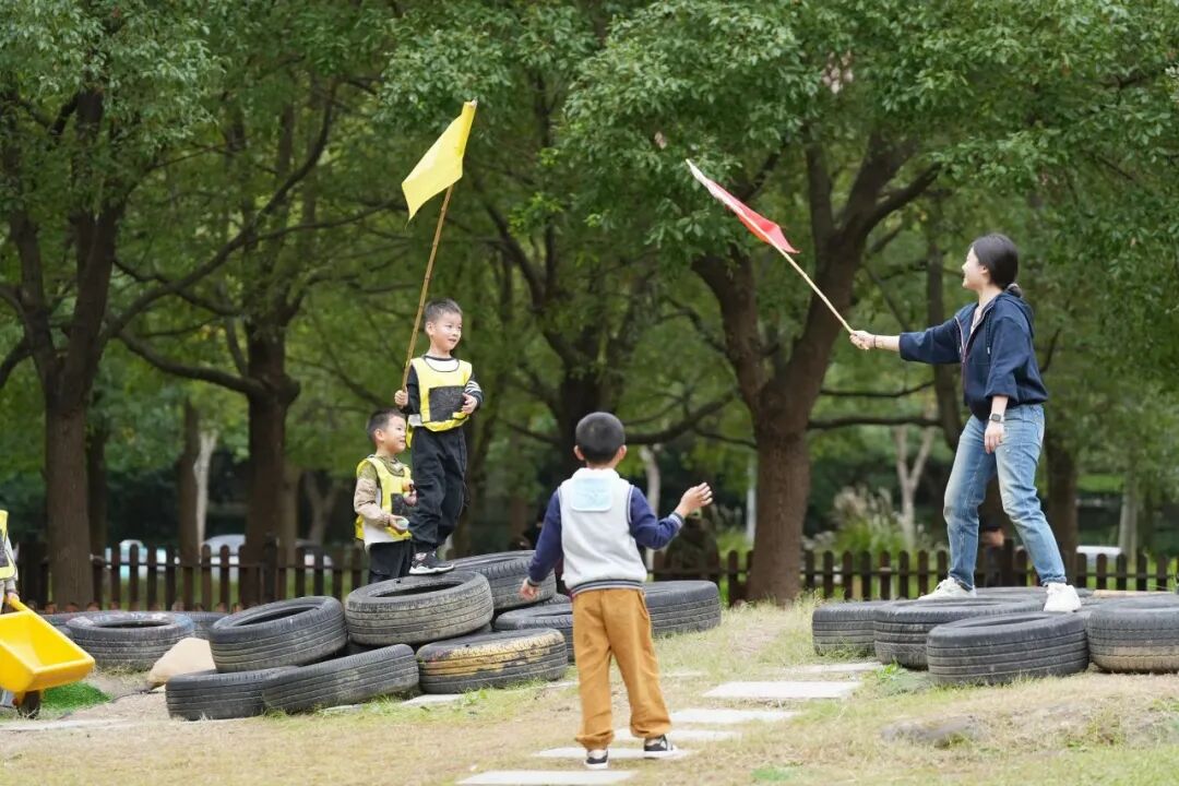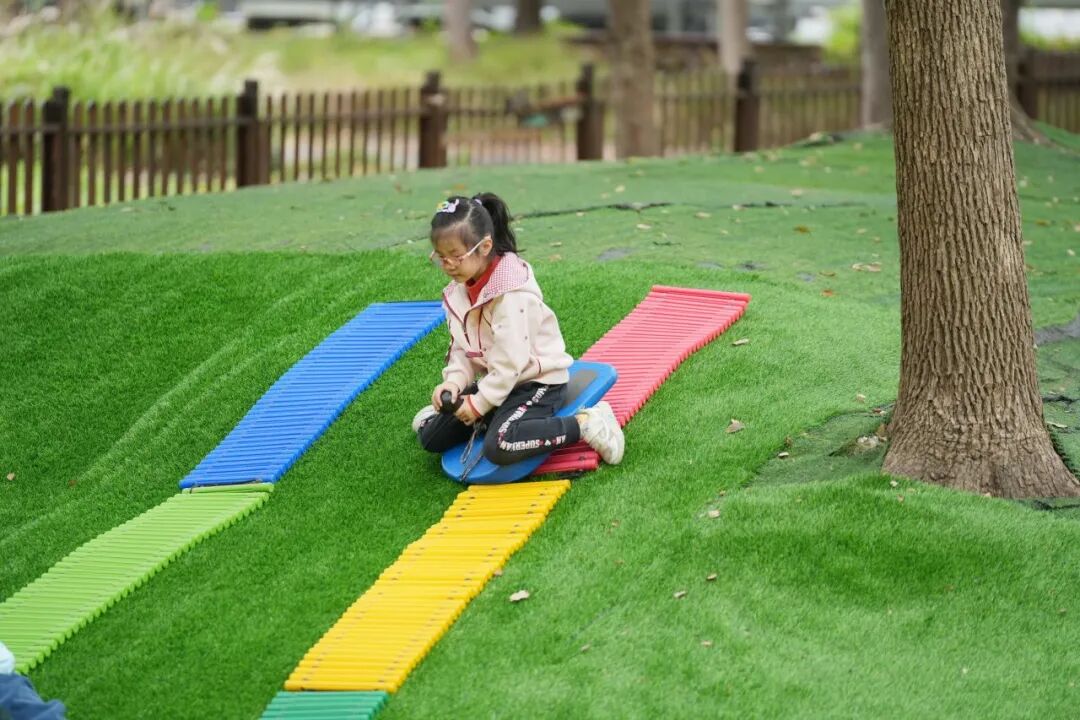 观摩现场,童真童趣亲自然 观摩现场,童真童趣满溢自然。内庭院里,孩子们悉心照料小鸭子、操作温室栽培;果树林中,泥巴雕塑、美食、道路在小手间诞生;草坡区,托班宝贝与沙、树叶、柚子风铃互动,敲打着锅碗瓢盆乐此不疲;湖畔趣园里,竹梯跷跷板、壕沟对抗等游戏,让孩子们在自主探索中突破身体协调与规则创新,生动诠释了 “放手”“自主”“共玩” 的教育价值。