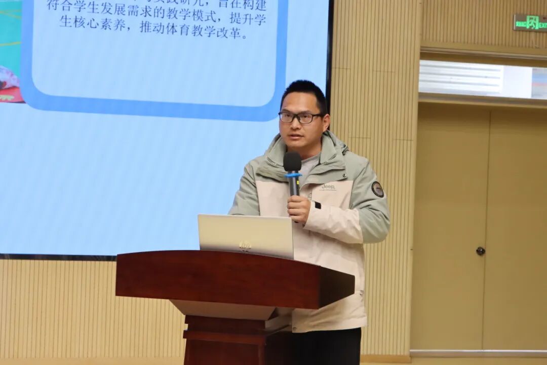 教研员李文峰老师针对课堂教学进行点评,认为张老师的课堂教学能激发学生学练兴趣,充分利用场地器材;敢于挑战难度教材彰显了张海景老师良好的专业素养;大单元教学设计结构清晰,注重“学、练、赛、评”一体化教学方式,有效帮助学生掌握专项技能。同时李老师也针对大单元教学设计与实施中有效落实评价,关注技术赋能体育课堂教学方面提出了建议。