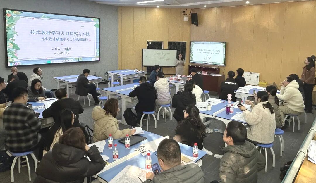 二、经验共享: 作业设计中的学习力生长 在教研领导力的框架中,资源整合与经验转化是学习力的重要表征。嘉定一中孙生红老师的《校本教研学习力的探索与实践》专题分享,系统呈现了作业设计赋能教学研究的逻辑: 1 目标定位 通过学习课程标准和分析教材内容,构建“单元作业目标矩阵”,以确保作业目标与教材现有练习的互补; 2 学情贯通 结合作业情况定位学生认知难点,设计分层作业框架,贯穿本单元的实践动手类作业也要兼顾不同层次的完成情况; 3 技术融合 引入“AI智能体弹力球实验小助手”,为实践类作业提供个性化指导,突破传统作业反馈滞后的问题。 孙老师特别强调,本次作业设计的跨校教研团队通过分工协作、定期研讨与资源共享,形成可迁移的作业设计模式。这一实践不仅解决了“资源碎片化”问题,更通过结构化知识转化,推动了区域教研共同体的协同发展。