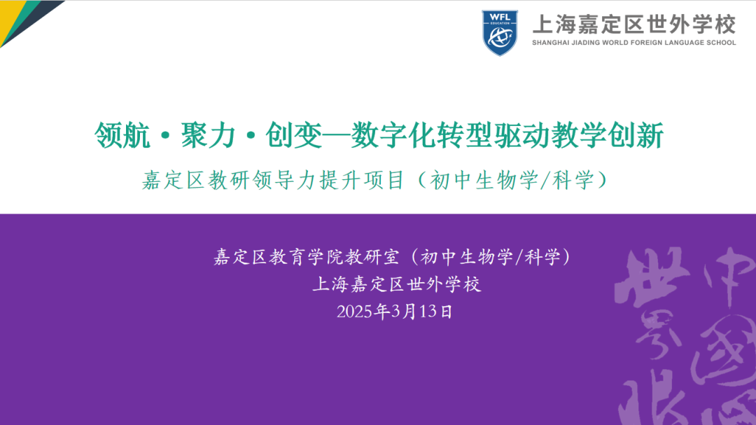 为了解学校发展需求和教师教学困惑,切实推进数字化转型驱动教学创新,全面提升教学质量。2025年3月13日,嘉定区初中生物学/科学教研团队以“领航·聚力·创变—数字化转型驱动教学创新”为主题在嘉定区世外学校开展了教研领导力提升项目(初中生物学/科学)研讨活动。参加本次活动的有嘉定区世外学校校长朱萍以及学校科学学科、生物学学科组长、教师。活动由嘉定区教育学院初中生物学/科学教研员陈晓岚主持。
