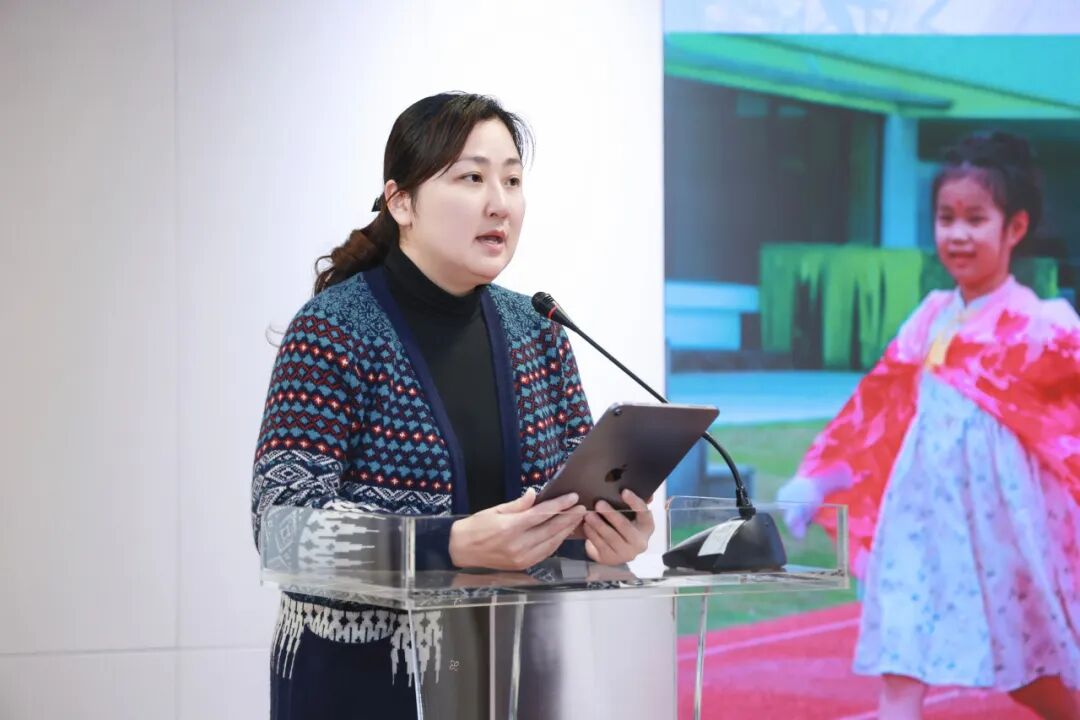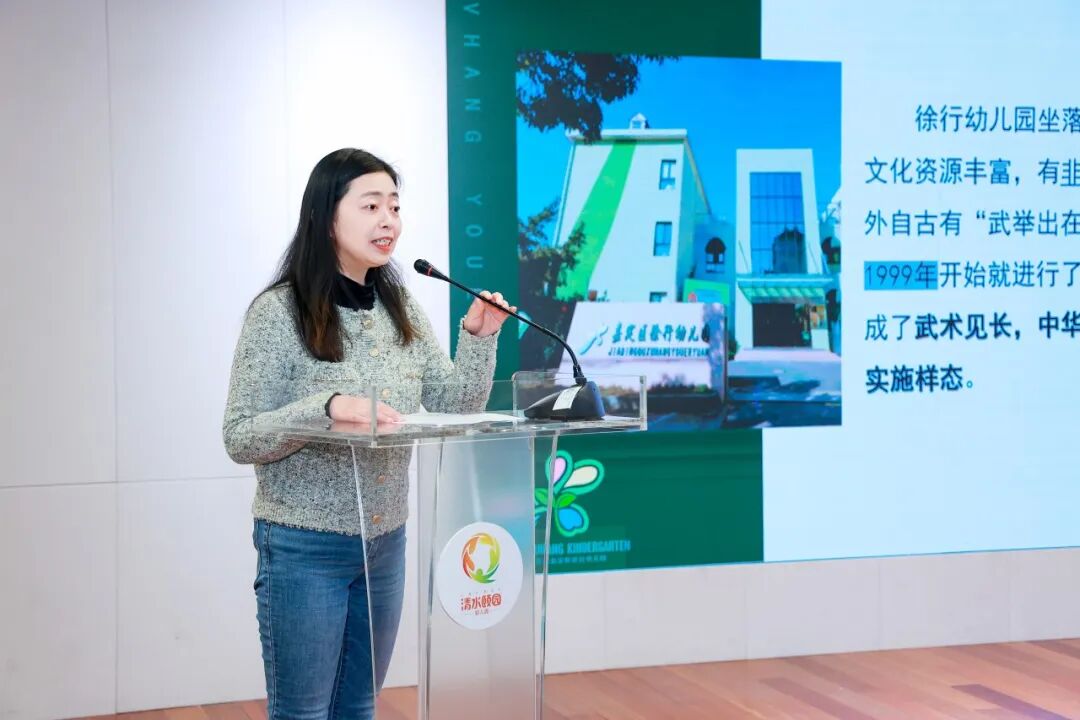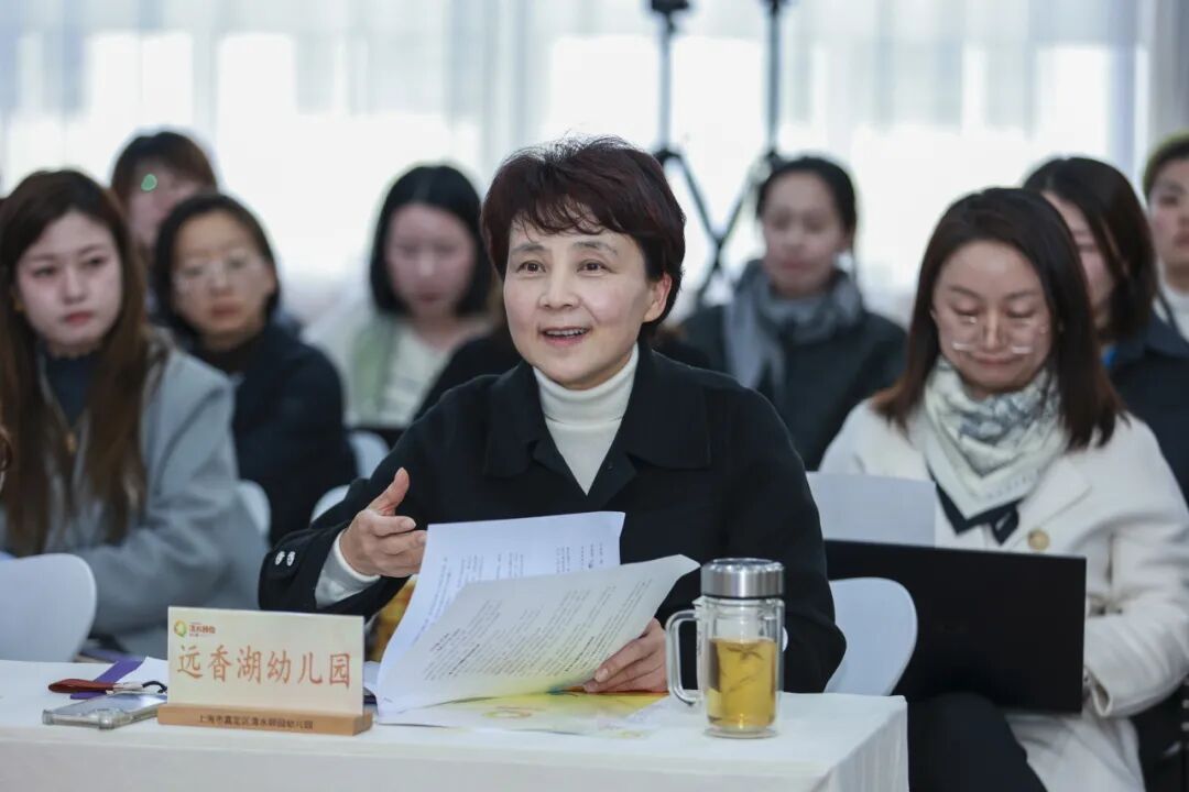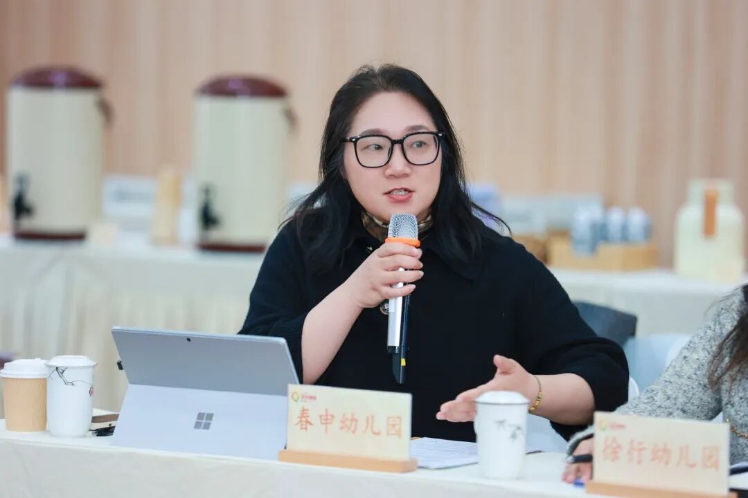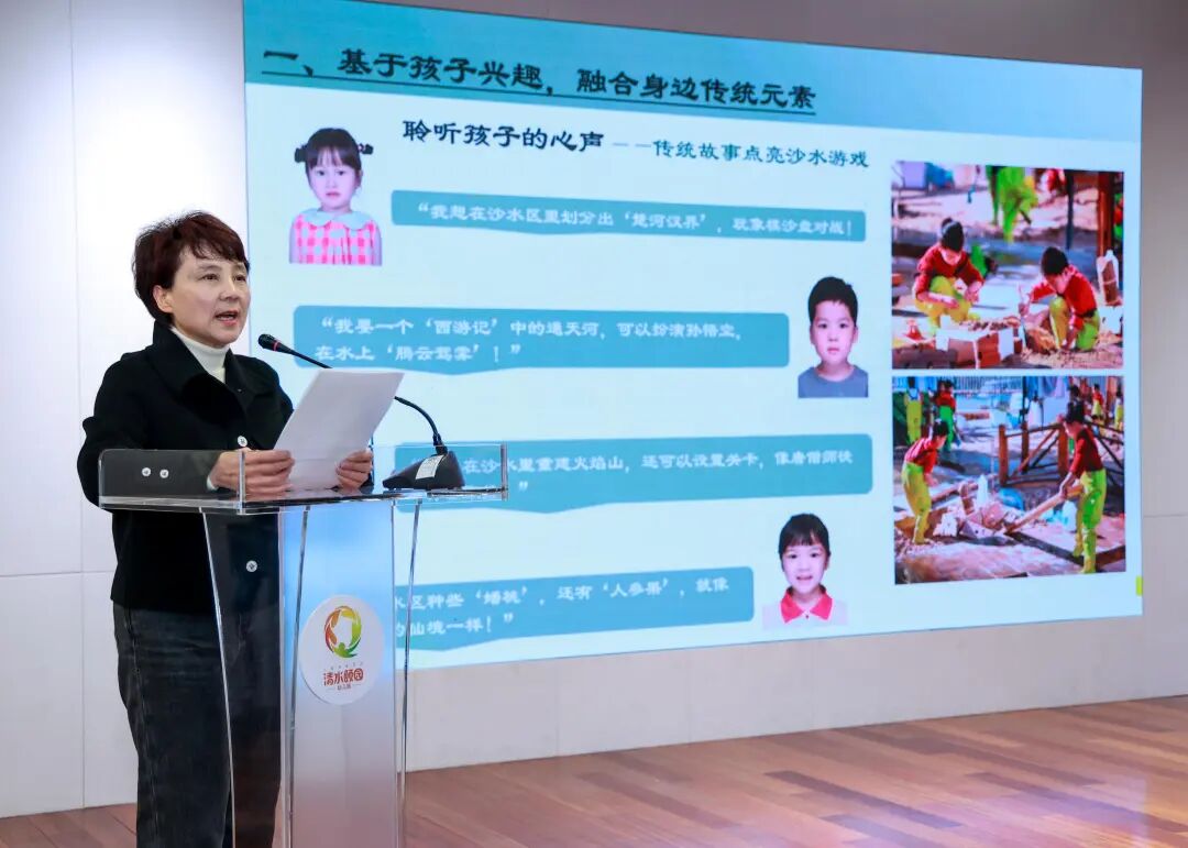 实践分享 五位参与嘉定区幼儿园课程领导力研究的园长汇报了项目阶段的研究成果,分享了各自幼儿园如何将传统文化融入课程的实践和思考。 中福会新城幼儿园园长李静围绕主题《节日赋权,课程领导力滋养文化传承》,分享了如何借助节日资源增强课程领导力以促进文化传承的策略;徐行幼儿园园长王童娟,以《构建儿童为本的课程迭代与创生——文化传承视域下课程园本化的深化研究》为题,分析了课程园本化的发展,并强调了以儿童为中心的课程建设理念;春申幼儿园园长孙伟茹,她的分享主题是《让传统文化扎根生长:幼儿园课程环境创设的实践思考》,她对课程环境的创设进行了深入探讨,并强调了环境在课程实践中的育人作用;远香湖幼儿园园长朱小萍带来了题为《古今交融,多元联结——传统文化下的幼儿园活动》的分享,展示了在传统文化背景下幼儿园活动的创新形式,以及多元融合的课程活动设计思路;清水颐园幼儿园园长赵丽以《儿童立场下民乐在幼儿园课程实践中的传承与生长》为题,详细介绍了如何从儿童的视角出发,将民乐巧妙地融入幼儿园课程之中,通过实践深入理解与精准把握幼儿的兴趣和需求。 各园的汇报内容丰富多彩,从多个视角展示了幼儿园在课程领导力方面的探索与实践成果。 活动展示 清水颐园幼儿园通过视频展示了将民乐与民间游戏深度结合,并巧妙地融入幼儿日常课程的创新教学实践。在视频中,随着悠扬的民乐曲调,幼儿欢快地参与传统民间游戏,充分体验传统文化的独特魅力。这种创新方法,自然而然地将传统文化的传承融入课程实施之中。