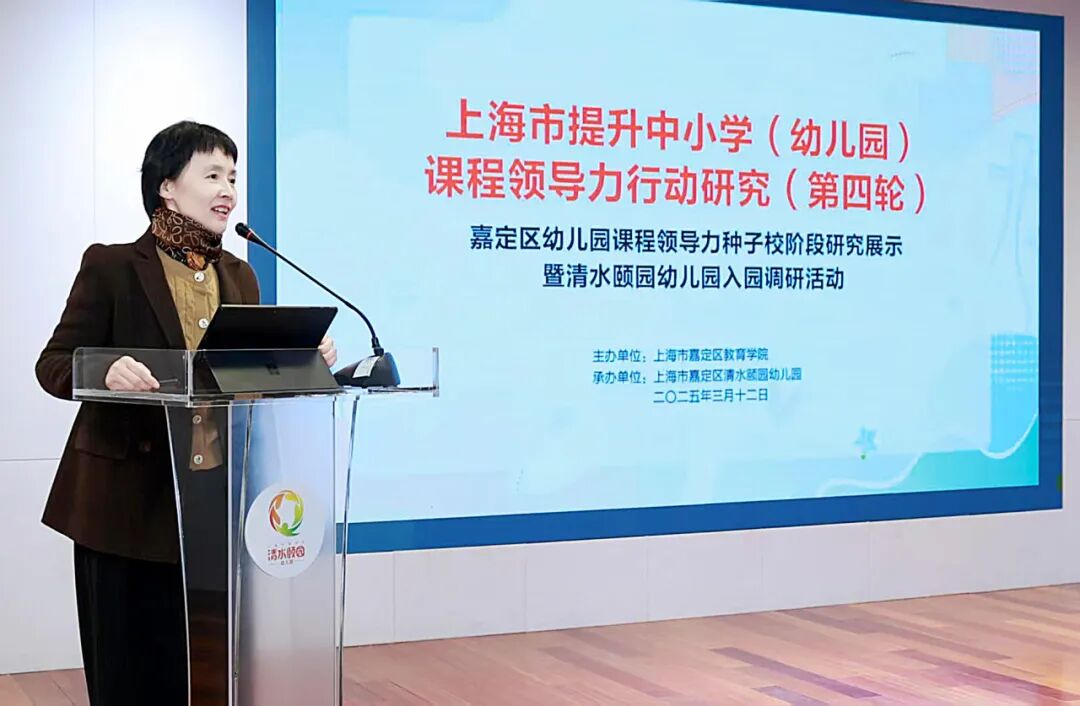 出席本次调研活动的有上海市课程领导力项目负责人、上海市教师教育学院幼教教研员贺蓉、嘉定区教育局学前教育科科长李珊珊、嘉定区教育学院学前教研员以及清水颐园幼儿园、徐行幼儿园、中福会新城幼儿园、春申幼儿园、远香湖幼儿园、菊园幼儿园、叶城幼儿园、鹤栖幼儿园、云翔幼儿园、伊宁幼儿园等种子校正副园长、教师代表;浦月娟学前教育工作室全体成员。活动由嘉定区教育学院幼教部主任陆静主持。 李珊珊在致辞中提到,幼儿园在项目研究中展现出了令人欣喜的专业热情与深度思考。一方面,注重从课程的继承与发展上进行迭代更新;另一方面,从课程领导力的核心要素出发,不断思考如何切实增长园长和教师的课程领导力。她强调:园长作为课程发展的引领者,首当其冲,他的课程领导力应该是要体现在对教育方向的精准把握,对课程规划的科学设计,对团队建设的精心培育上。教师作为课程的直接实施者,课程领导力应该体现在以幼儿为本的保教实施中。她还提出:坚信和坚持课程领导力的研究和探索,是我们以后长期要走的路。