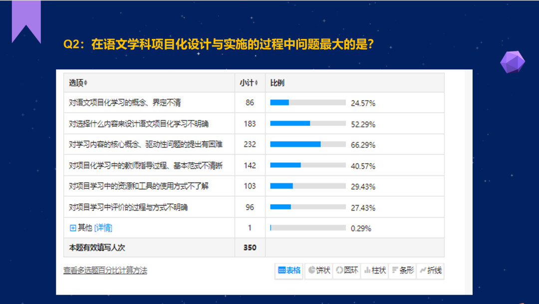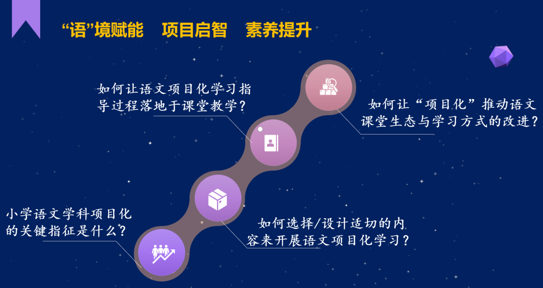 聚焦:语文学科项目化教研的主题与方向 活动伊始,胡炜烨以微报告的形式解读了本次教研的主题,并通过问卷数据,剖析了各校开展语文学科项目化学习的现状及问题。她提出,要从教材出发、从微项目开始,借力序列化专题教研来探索和解决小学语文学科项目化学习中的四个关键问题: 小学语文学科项目化的关键指征是什么? 如何选择/设计适切的内容来开展小学语文项目化学习? 如何让小学语文项目化学习指导过程落地于课堂教学? 如何让“项目化”推动小学语文课堂生态与学习方式的改进?
