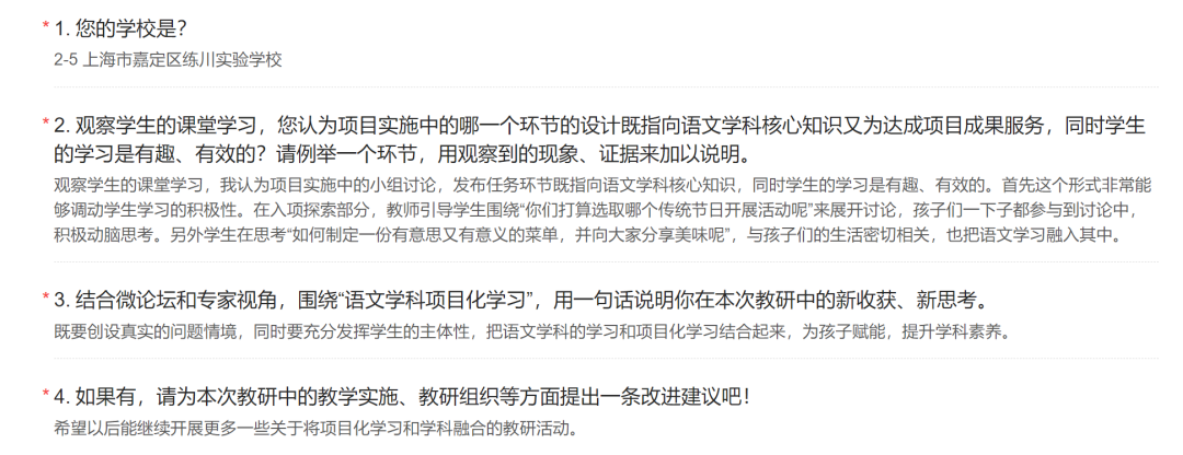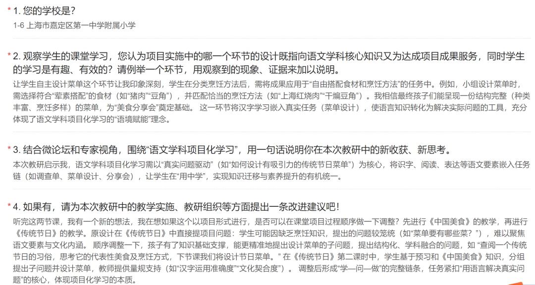 齐研:剖析课堂背后的项目设计与实施 基于学生成果展示、入项探索和知识能力建构课例,新城实验第二小学的三年级与二年级语文备课组通过论坛分享了“节日小‘食’光”项目的设计、实施和迭代的过程,进一步明确了语文学科微项目的核心知识、本质问题在项目设计初期的“定性作用”。他们通过对课标、教材和项目目标的综合分析、项目实施的课时安排和整体架构等方面的分享,为线上线下的老师提供了项目化学习融于语文课程体系的新思考。 同时,老师们围绕“哪一个环节的设计既指向语文学科核心知识又为达成项目成果服务,同时学生的学习是有趣、有效的”这一教研问题,细心观察课堂教学实施,倾听论坛交流,并结合所见所闻的证据分享了自己在教研中收获并提出中肯建议。上海实验学校嘉定新城分校、上海市嘉定区嘉二实验学校的两位老师参与现场互动,其余场内和线上观看直播的教师们纷纷通过“问卷星”平台实时参与教研。 左右滑动查看更多
