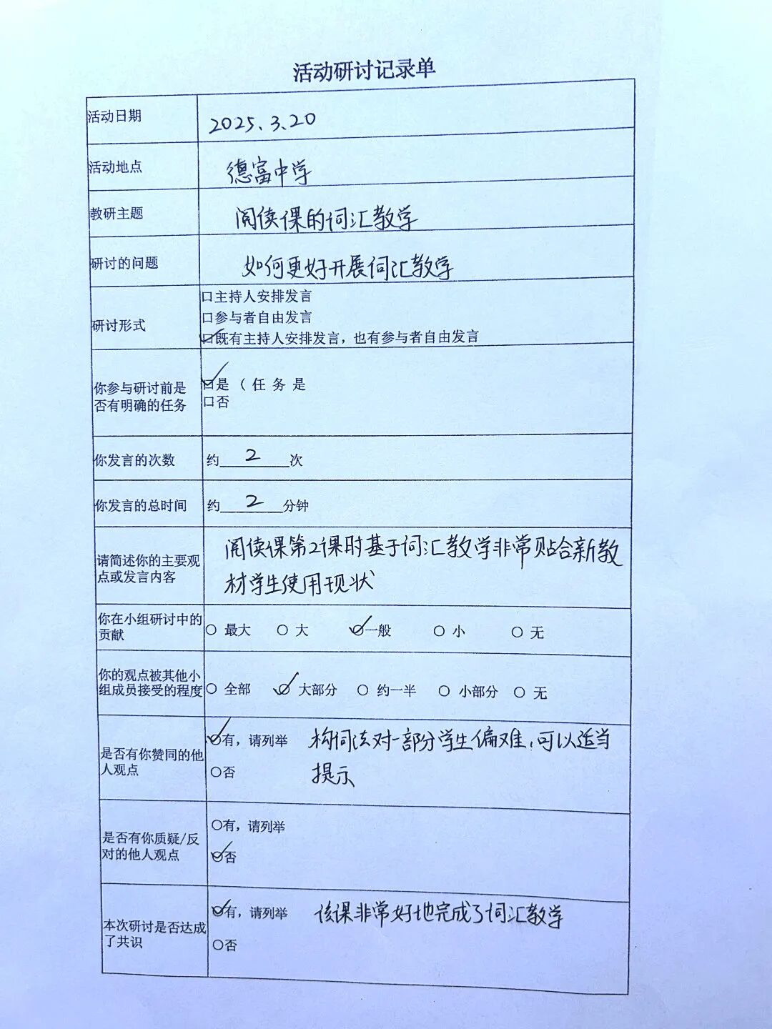 在接近三个小时的深度研讨中,教师们通过结构化的任务驱动,实现了从经验型教研向实证型教研的转变。系列教研表单系统实现了教研成果的可视化留存。三位专家提出的建设性意见,更为后续教研提供了专业生长点。 此次活动不仅验证了"工具赋能+专业引领"的教研实践力发展路径,更彰显了教研领导力在教师专业发展中的引擎作用。期待交中德富中学继续以教研领导力提升项目为支点,在"双新"背景下持续深化教学改革,让每一次教研都成为教师专业成长的阶梯,让每一节课堂都闪耀学科育人的智慧光芒。