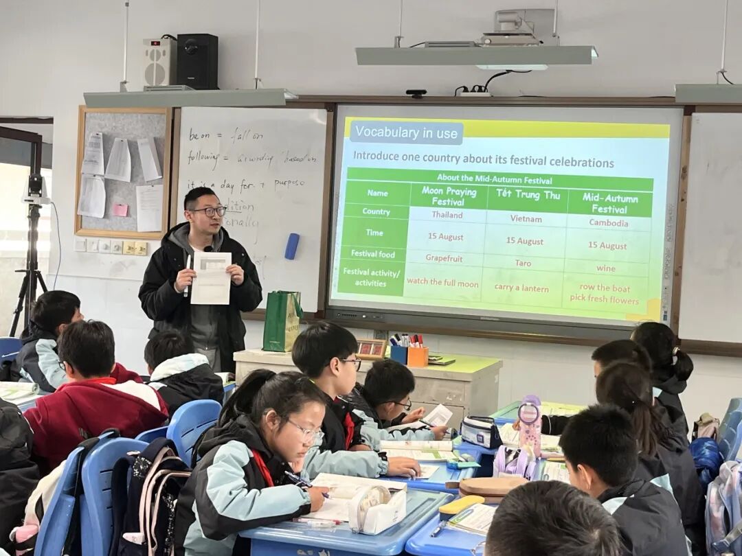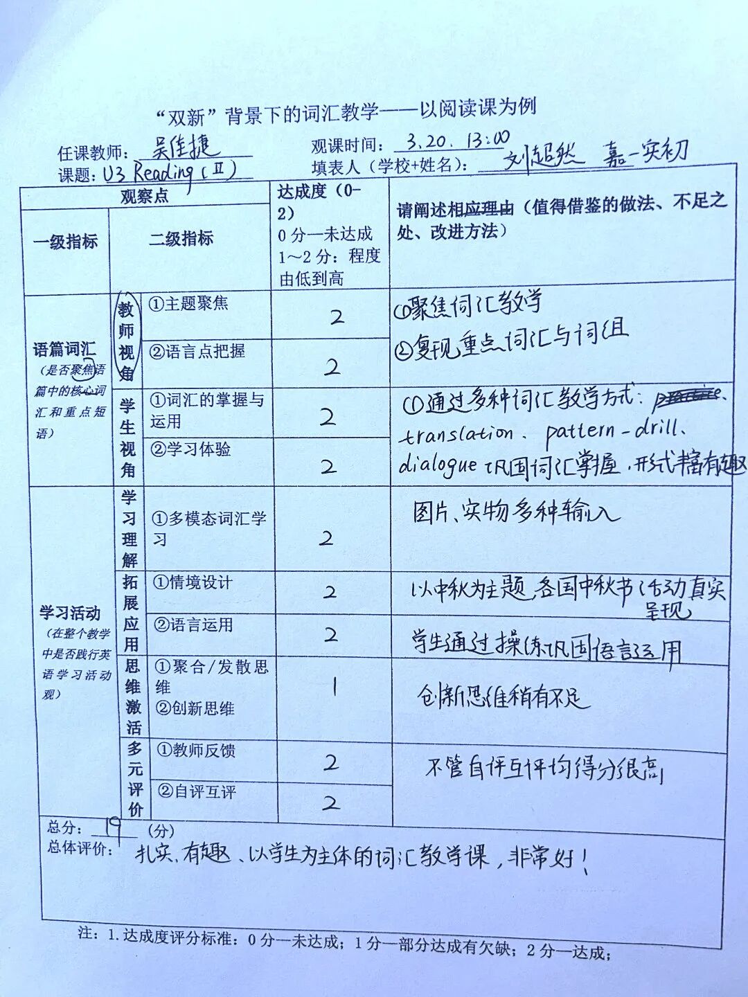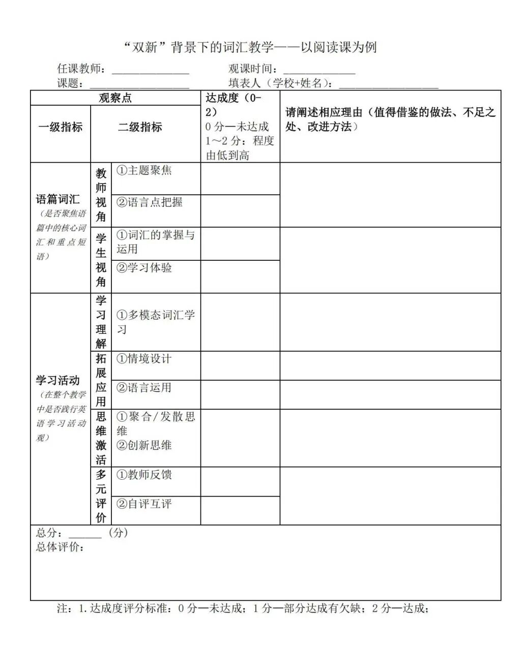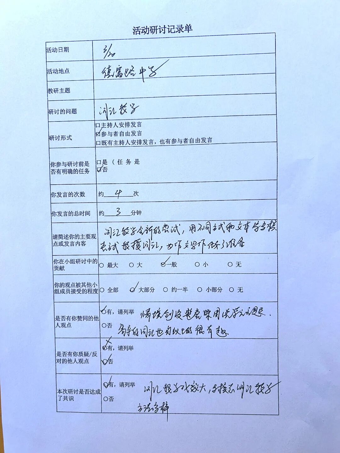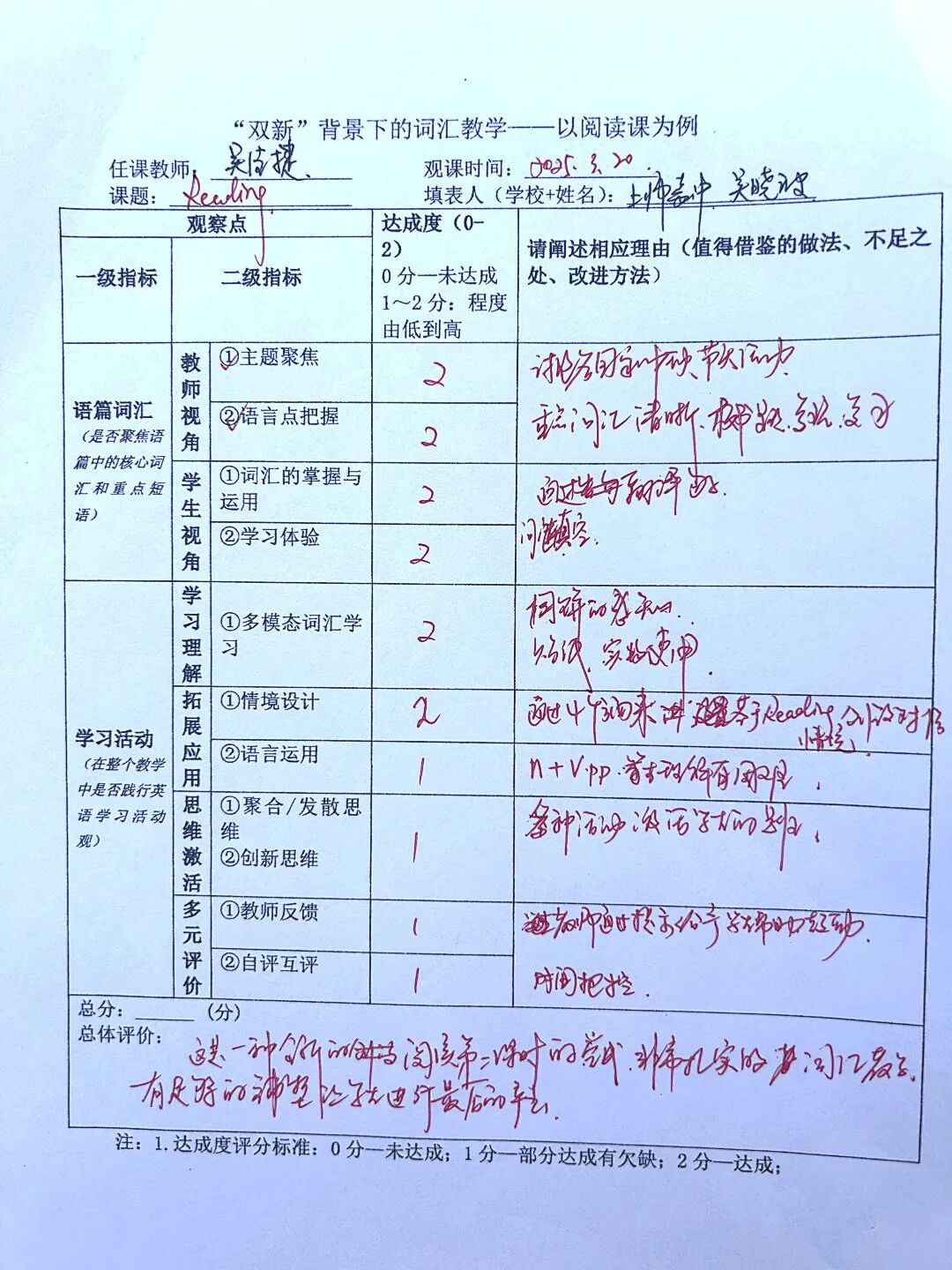 一节课堂教学 吴佳捷老师开展“上教版”6BU3 词汇巩固和拓展教学,教学活动围绕阅读语篇的话题“Festival celebrations” 展开,从Time、Purpose、Food以及Product四个维度开展核心词汇的巩固和运用。教师很好地运用多模态的教学资源,激发学生词汇学习的积极性。最后,在产出环节,学生能尝试运用目标词汇,用准确的语言进行口头描述和书面表达,解决深层次问题。 一组工具支持 在本次教研活动中,为了提升教研“实践力”,老师们随机抽签分组,领取听评课任务,围绕量表进行观课,做到人人发言。 其次,教研支持工具也促进了“实践力”的提升。在教研活动前,教研组长发布活动预告单,让组员进行活动预习,做好准备。在教研活动中,老师们撰写《活动研讨记录单》,积极参与教研活动。在教研活动后,教研组长填写《活动要点记录单》,为下一次教研活动做好铺垫。整场教研活动也通过AI软件进行话语分析,做好教研总结。 一次思维碰撞 在本次教研中,各组积极交流,产出丰富。 第一观课小组从教师视角,围绕“主题聚焦”和“语言点把握”进行观课。该组教师代表表示,本堂课主题明确,能依托教材语篇,聚集主题词汇的巩固和内化,语言点把握准确,建议增加情境设置和学生讨论,让更多学生参与课堂活动。 第二观课小组从学生视角出发,围绕“词汇的掌握与运用”以及“学习体验”进行观课,该组教师代表提出,本节课词汇教学方式更换丰富,能大大提高学生的记忆效果,词汇教学过程中也迁移出了文化意识,建议给学生留足思考的时间。 第三观课小组从学习理解和拓展运用视角出发,围绕“多模态词汇学习”“情境设计”和“语言运用”进行观课,该组教师代表提出,本课情境设计贴合单元主题,结合学生生活实际,使学生有话可说,建议老师给足支架,解决学生难词不会表达的困扰。 第四观课小组从思维激活和多元评价视角出发,围绕“聚合/发散思维”“创新思维”“教师反馈和自评互评”进行观课,该组教师代表提出,本堂课创新点在于产出方式多样化,也使用了多模态教学形式,建议产出环节增加学生自评互评的时间。 何欣老师就词汇教学、情境创设、思维激发以及知识点迁移的重要性等方面做出指导,强调了理解文本和中心词汇梳理后深入挖掘文本内容,以及根据学生实际水平设定教学目标的必要性。 盛肇靖老师提出,通过具体的教学活动和任务,如基于真实情境的语用表达,能有效促进学生词汇学习的动力,提升语言能力。她指出基于语篇的词汇教学应注重学生个体思考和创新能力培养,而非仅限于模仿。此外,结合学生情感体验和文化背景加深对词汇的理解与运用,以及词汇教学在单元学习中的连贯性和重要性也值得我们进一步思考与研究。