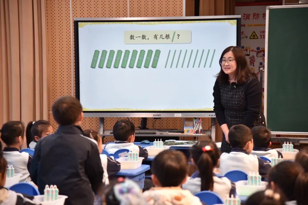 互动研讨 思维碰撞 优化设计 基于两节课的教学实践,教师们针对“如何进一步优化活动设计,促进数学理解”展开研讨。长宁区教育学院张景怡老师在点评环节高度肯定课堂设计的创新性,基于儿童经验,聚焦计数单位,设计循序渐进的学习进程;遵循认知规律,选择合适的学具辅助学习,经历“行为-图像-符号-语言”的学习过程;依据年龄特点,在趣味性的游戏中发展数学思维。张老师也提出了进一步优化活动设计的改进建议。