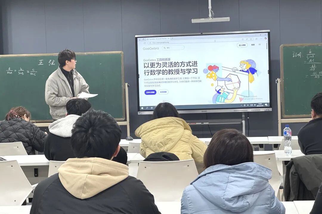 上海大学附属嘉定高级中学金山老师作《例说GeoGebra在数学教学中的使用》专题分享。讲座从软件功能解析、动态演示技巧到教学案例实操,系统展示GeoGebra如何将抽象数学概念可视化。金山老师提出:“技术工具应与教学逻辑深度融合,以动态复现历史经典证明,增强课堂的时空纵深感。”与会教师纷纷表示,讲座为信息化教学提供了新思路与实践范本。
