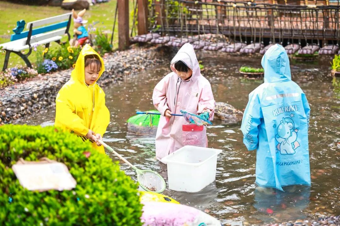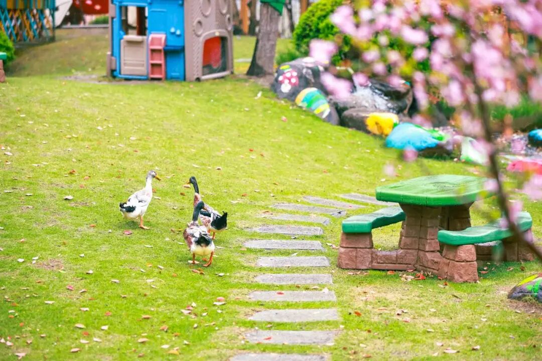 班级、山坡、草地、池塘等都是孩子们在院子里生活、游戏的空间。室内外空间贯通、多元的自然环境、丰富的活动材料,给予幼儿亲历体验、自主探索、独立思辨、个性表达等充实与丰富的成长经历,支持孩子自然流畅的一日生活,孩子们在幼儿园对自己一日生活的提议与决策,展现了每一个孩子的独特性以及有能力的学习者形象,实现生活、学习、发展一体化的生命成长过程。