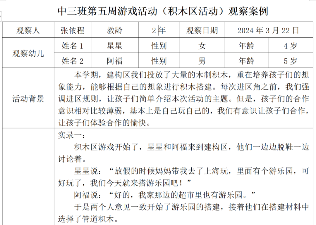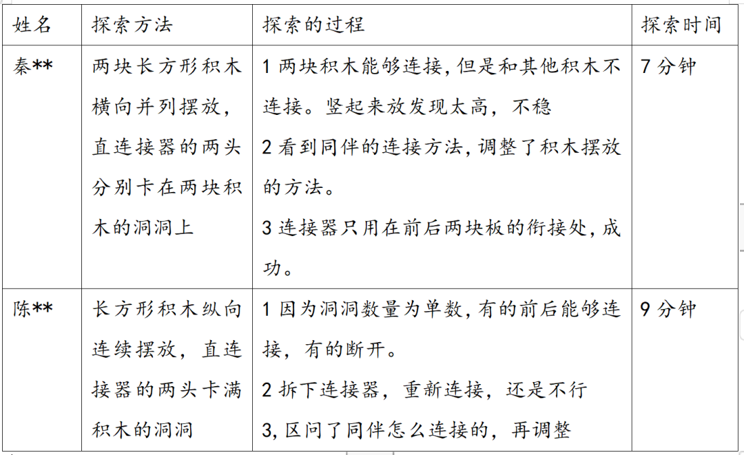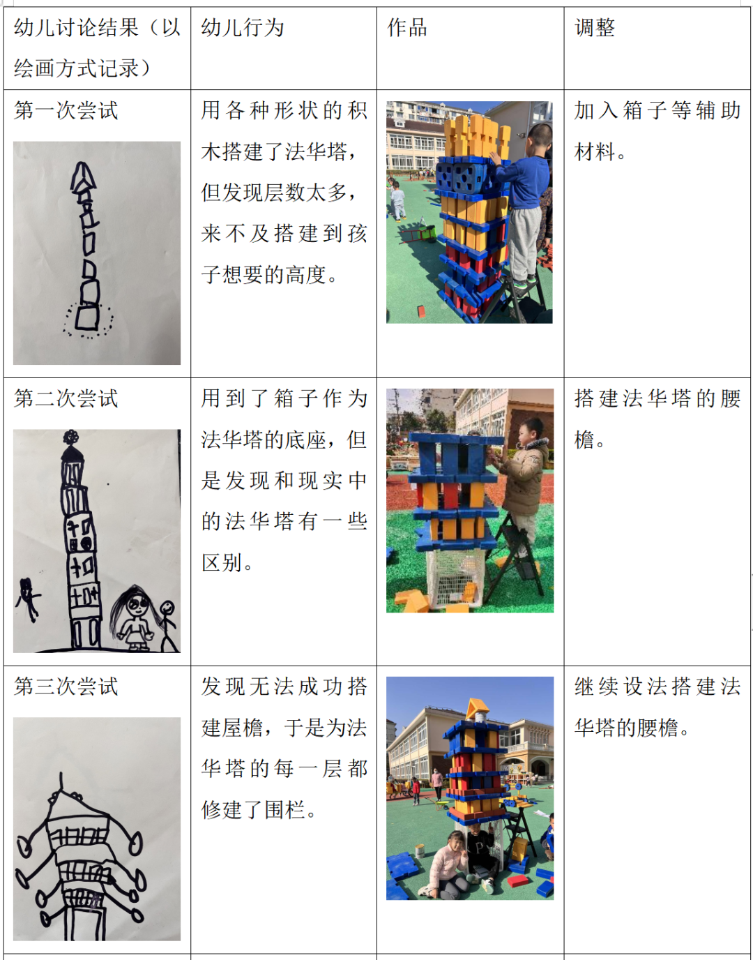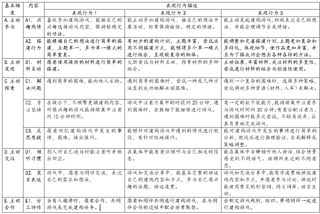 上海市嘉定区清河路幼儿园 张依程 《幼儿园保育教育质量评估指南》中明确指出:教师要善于“发现和支持幼儿有意义的学习”“相信每一个幼儿都是积极主动、有能力的学习者”。建构游戏对幼儿发展具有重要价值,它能够促进幼儿的认知能力、创造力、问题解决能力、社交技能和语言表达等多领域能力的综合发展。 一、问题的提出 中班幼儿正处于好奇心、想象力和学习能力等迅速发展的时期。通过对建构游戏的持续性观察和实践,我们发现以下问题: 建构游戏是一条能够推动幼儿主动学习的途径。教师通过观察幼儿的建构过程,思考并实践支持策略,来培养幼儿主动学习的品质。基于此,我们确定了研究的主要内容。 二、编制建构游戏中幼儿 主动学习表现行为观察指引 1.观察指引的制定 依据霍力岩等人制定的《学前儿童主动学习关键性发展指标体系》,结合幼儿建构游戏实际过程,参照上海市《3—6岁儿童发展行为观察指引》进行观察指引的编制,提高观察的针对性和可操作性。 表:建构游戏活动中幼儿主动学习表现行为观察指引 2.观察的方法和记录 通过对观察指引进行勾选的方式、并附以照片或者视频佐证。借助孩子通平台,生成了直观的观察数据,有助我们进行科学、系统分析。 表:中班建构游戏观察案例 表:孩子通平台生成的观察数据统计 三、中班建构游戏中支持 幼儿主动学习的策略 1.环境升级,开放建构游戏场域与时间 (1)联动室内室外环境,引发幼儿主动选择 (2)从每周一次半小时到阶段性多频次,幼儿主动深入的时间长 研究中发现,幼儿单次游戏时长在一定程度上影响了建构能力的提升,只有给幼儿足够的时间和频次进行建构,持续地探索、主动地创新过程越多。 图:幼儿前期作品vs幼儿建构频次增加后作品 图:幼儿前期作品vs幼儿建构频次增加后作品 (3)营造积极的心理环境,提供情感支持,幼儿主动游戏的情绪高 2.材料按需调整,鼓励幼儿跨区域取材 (1)基本材料先投放,有减有加做调整 先投放基本材料,教师观察幼儿的喜好,基于幼儿感兴趣程度在数量上做减法或者加法,再进一步添加有挑战性的材料。 表:以洞洞积木投放顺序为例(部分) (2)根据建构内容和需求,鼓励幼儿主动寻找、跨领域使用 户外场域中除了建构材料,还有运动材料、自主游戏的多元材料,幼儿在可以自主取用。 图:幼儿搭建的酒店 图:“酒店”内设施 3.“讨论-实施-回顾”三环节,点亮幼儿主动性 表:以中三班建构游戏流程表为例 (1)巧用开始前五分钟,引发幼儿主动参与、讨论 引发幼儿主动思考:玩什么 图:建构前幼儿思考的内容 进行建构前自主讨论:怎么玩 表:幼儿的讨论、行为、作品、调整(以法华塔为例) (2)建构过程中尊重幼儿主动性,引发自主实践 非必要少打扰、多观察,鼓励幼儿主动探索 在保障安全的前提下,即使幼儿遇到了问题,主动地尝试方法解决时,教师也不干涉、不打扰幼儿的行动。 接纳幼儿诉求,引导自主发现问题 面对中班的孩子“告状”,教师先接纳幼儿的诉求,同时引导幼儿自主发现问题。 激发内驱动力,支持幼儿主动交往 中班幼儿渴望建构目标达成、游戏的深入时,会主动与成人或者同伴交往,可见激发幼儿内驱动力是关键。 观察记录量化,点赞幼儿专注坚持 教师通过持续的支持策略,让幼儿获得主动学习的方法和经验。 图:幼儿尝试搭建消防车 图:幼儿搭建消防车时使用连接器 表:幼儿的探索过程(以搭建消防车为例) (3)回顾交流,引发幼儿主动传达经验 “叽叽喳喳”先讨论,满足更多幼儿主动述说 在建构游戏的交流分享中,给幼儿一些时间,鼓励自由讨论。 图:幼儿在进行小组讨论 “你问我答”互动墙,分享阶段性问题与发现 版面用于呈现幼儿在建构游戏过程中发现的问题或者解决的方法,以此给幼儿相互共享经验的机会。 图:“你问我答”互动墙 “宝藏方法”多挖掘,放大幼儿主动学习亮点 建构游戏的集体交流分享是一个重要环节,是推动幼儿主动学习的关键机会。在本园的专题教研中,也对“交流分享说什么”进行了梳理: 图:教研梳理:游戏的交流分享说什么 在建构游戏后,教师基于对幼儿在建构过程中的观察,提炼他们主动学习中的突出亮点,放大说,夸张说,引发后续游戏中幼儿的主动学习。 图:教师和幼儿在进行集体交流分享 “画语解读”一对一,肯定个体幼儿的成长点滴 “画语解读”中,幼儿讲述,教师倾听,师幼关系更加密切,教师更好地理解幼儿的游戏过程和思考方式。 图:幼儿作品和与之对应的画语解读 四、实施效果与思考 在游戏中,幼儿的积极性与参与度大幅提升。游戏前幼儿讨论、记录想法,减少了无计划行为。在教师引导下,幼儿能主动选材料、发现问题,主动探索与处理问题的能力得以锻炼。游戏时,幼儿专注度和交往能力增强。在一对一倾听、分享环节,幼儿的倾听习惯也有所提升。 通过仔细地观察幼儿的游戏进程,教师对于幼儿的“讨论-实施-回顾”的行为进行详细记录,分析和复盘之后再决定如何支持。教师一步步积累了经验,体现了教师对幼儿主动学习的支持能力的增强。 在今后的研究中,还可以参考高瞻课程模式,对如何引发中班年龄阶段的幼儿在建构游戏中主动学习做更进一步的探索。