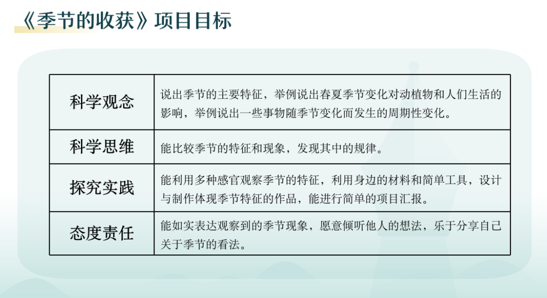 驱动性问题是项目学习的出发点和核心,它能够引发学生自主探究和深入思考。学科项目的驱动性问题应紧密围绕《学科教学基本要求》和《课程标准》,确保学生的项目学习活动符合教学要求。此外,驱动性问题通常应与学生的生活紧密相关,能够引发学生的兴趣和好奇心,促使他们主动探究。 以一年级科学学科项目《季节的收获》为例。教师在研读《义务教育科学课程标准(2022年)》,梳理了一年级两册教材与“季节”相关的内容后,明确了该项目的目标(如表1)。进而,教师提出项目本质问题——季节的变化有什么特征? 表1:《季节的收获》项目目标 结合新城实小四大特色节气活动,“春播”“夏种”“秋收”“冬藏”,教师对本质问题进行转化,在入项时便提出驱动性问题——“在春播节中,如何以实物或表演的方式呈现季节的变化?”驱动性问题与学校特色活动相结合,鼓励学生以多种方式展示季节的变化,激发了学生极大的兴趣和热情。 本质问题是项目学习的基础,直接承载着项目学习目标,为后续问题的衍生与拓展奠定坚实基础。对本质问题进行巧妙转化,使抽象的学科知识更具情境性与可操作性,最终形成驱动性问题。为学生开展项目学习搭建起一座从理论到实践的桥梁,引领学生开启充满趣味与挑战的学习征程。