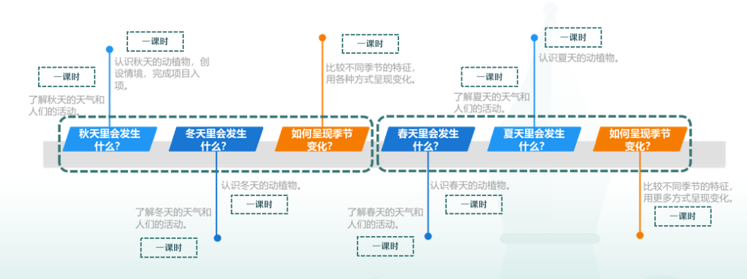 当项目驱动性问题尘埃落定,对其进行合理且深入的分解便成为关键环节。这一过程如同将一幅宏大的拼图拆解为一个个相互关联的小块,通过形成逻辑严密的问题链,并进一步细化为具体的任务群,为整个项目学习构建起清晰的脉络与架构。如此一来,各个课时的教学任务得以统筹规划,实现从顶层设计到具体实施的系统性布局,为学生自主开展项目活动提供全方位、多层次的有力支持。 以一年级科学学科项目《季节的收获》为例。分解驱动性问题,提出“秋天里会发生什么?”“冬天里会发生什么?”“春天里会发生什么?”“夏天会发生什么?”。每个子问题下设置2个子任务,聚焦天气、人、动植物在不同季节的变化展开研究。该项目尊重原有材编排的基础上,对其进行了优化和重组,跨两个学期,10课时完成(如图2)。 图2:《季节的收获》项目框架 由于一年级学生的认知能力有限,该项目安排两次出项。在第一次出项课中,教师鼓励学生以图画、绘本故事等简单方式呈现秋季到冬季的变化;第二次出项课中,学生以更多的方式,如季节海报、季节历、季节礼盒、角色扮演、故事表演等多种方式呈现四季的变化。 在分解驱动性问题时,需充分考量学生的认知水平与学习能力。以低年龄段学生为例,他们的认知往往较为直观、形象,子问题的表述应简洁明了、生动有趣,引导学生从身边熟悉的事物和现象入手进行观察与思考。而对于高年龄段学生,可适当增加子问题的复杂性与开放性,鼓励他们运用批判性思维、创新思维进行深入探究。