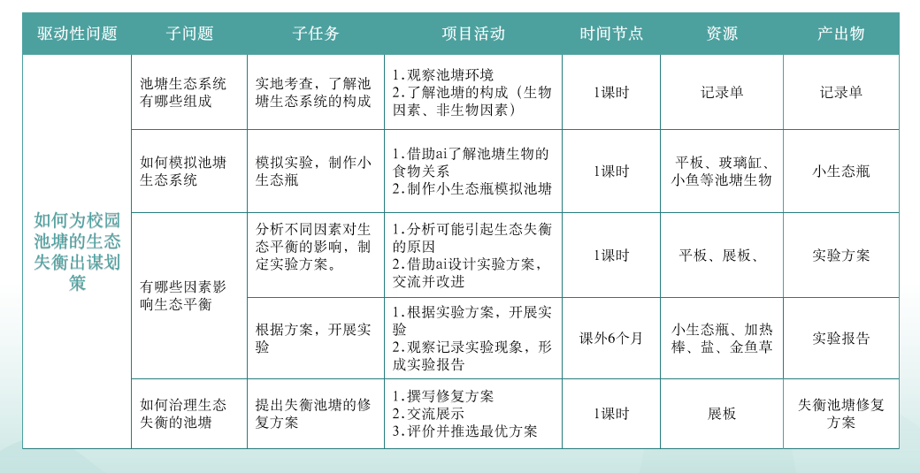 在搭建起完整的项目框架后,要想确保项目目标得以高效实现,明确每个子任务的详细要求和进度安排必不可少。这就好比为一场漫长的旅行制定详细的行程表,清晰标注每个景点的游览要求与停留时间,帮助学生有条不紊地安排学习进度,合理分配时间与精力,避免出现拖延或混乱的情况,为项目的顺利推进提供坚实保障。 以三年级科学学科项目《池塘生态保卫战》为例。此项目源于远东版《自然》三年级《池塘》单元内容。结合学生在开学初考查校园池塘时候观察到部分鱼死亡的现象,教师对原有“池塘环境”“池塘食物链”等内容进行了调整与转化,以项目的形式展开教学,提出“如何为校园池塘的生态失衡出谋划策?”这一驱动性问题。分解驱动性问题,形成任务链及任务群(如表2)。在此基础上,教师还梳理了每个课时的具体活动,时间节点、资源及产出物。 表2:《池塘生态保卫战》项目细化表 教师在梳理项目细化表时,可以根据项目的总时长和子任务的难度合理分配时间节点。如上表中项目子任务“根据任务,开展实验”预计耗时6个月。这样可以给予学生足够的时间,避免因时间紧迫而影响探究的效果。在项目实施过程中,可能会遇到各种意想不到的情况,如学生的学习进度比预期快或慢、出现技术难题等。此时,教师要根据实际情况对任务进行动态调整,给予即时的指导和支持,确保项目能够顺利进行。