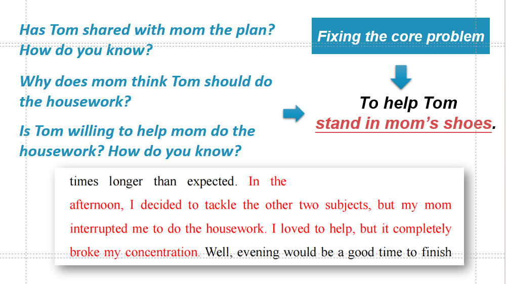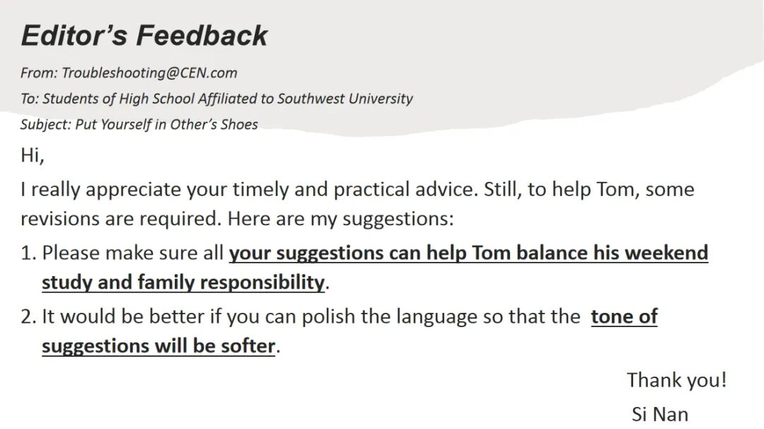 设计思路 司南老师聚焦“如何提升建议信的有效性”,以Tom的周末计划困境为例,带领学生从“归因失焦”到“精准把脉”,从“生硬说教”到“婉转建言”,帮助学生不仅实现建议信文字的优化,更取得思维与情感的同步升级。 本节课的教学内容基于校园英语新闻栏目中的一封求助信展开。学生Tom在信中描述了自己在周末学习时间管理上的困扰:尽管制定了详细计划,但执行中常因任务耗时超出预期(如数学题耗时过长)、家庭事务干扰(如被要求做家务)以及身体疲惫等原因,导致计划失败,最终陷入挫败感。写作任务要求学生以读者的身份,撰写一封建议信。 学生在课前完成了基于该任务的写作初稿,司南老师完成了批改。结果显示,大部分学生能完成建议类写作,但建议的有效性有待提升,主要体现在对“学习与家务冲突”的建议中。有效性不足的主要原因包括: (1)问题归因失当。学生缺乏思考:母亲是否了解Tom的学习计划安排;母亲是否认为Tom有必要去完成家务;Tom自己是否想要去承担家务; (2)功能用语单一。学生多用“You should…”这一句型提出建议,缺少使用更婉转的语言使“同伴建议”更容易被接受。 根据以上原因,司南老师制定了本节课的教学目标: (1)学生能够通过深入分析Tom的核心问题,梳理出提出有效建议的要点; (2)学生能够使用恰当的表达方式,使建议更易被Tom接受; (3)学生能够根据内容和语言方面的提示修改自己的草稿。