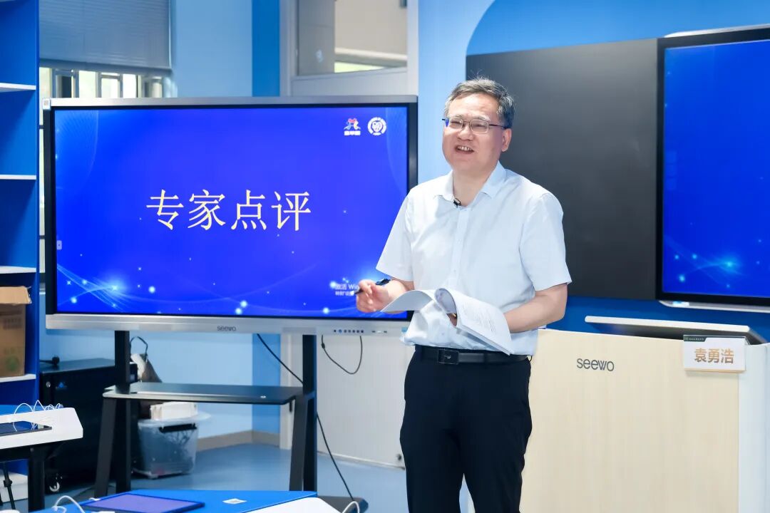 授课结束,林倩老师进行了说课。嘉定区教育学院小学英语教研员袁勇浩对授课内容和说课进行点评。袁老师肯定本节课对 “三个助手”平台的实践运用,指出其便捷的数据统计可高效整合课堂数据、精准的数据反馈能追踪学习轨迹,助力教学分析与策略调整。他还深入解读课程主题意义,从教学创新与素养培养维度剖析其育人价值,深化了教师对课程育人导向的认知。