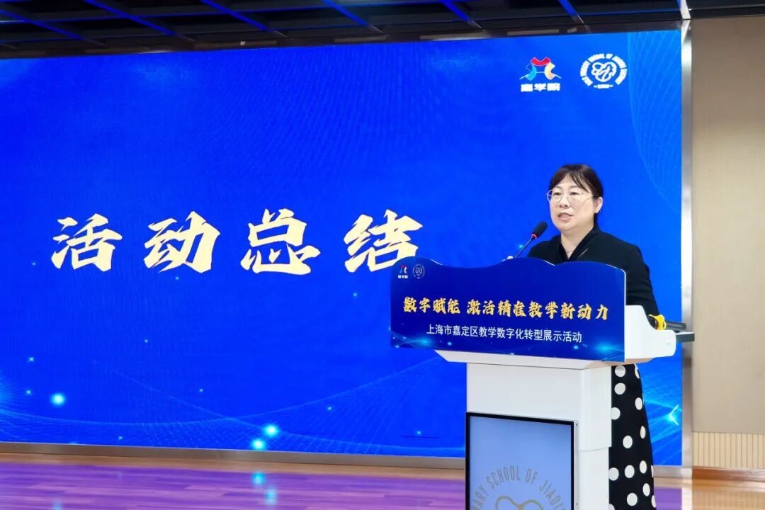 最后,邵红霞老师对本次活动进行总结。邵老师认为此次活动既是对前期实践成果的集中展示,更是对未来数字化教学改革的再动员,充分肯定了本次活动组织的成效。同时,邵老师展示了嘉定区教学数字化数据看板,呈现了嘉定区在数字化转型工作中的区域整体数据。聚集大数据分析,邵老师呼吁学校之间相互学习,补短板拉长板,建立教研共同体,希望各校以此次活动为契机,持续深化数字技术应用,打造更多数智赋能教学实践的 “嘉定样本”。