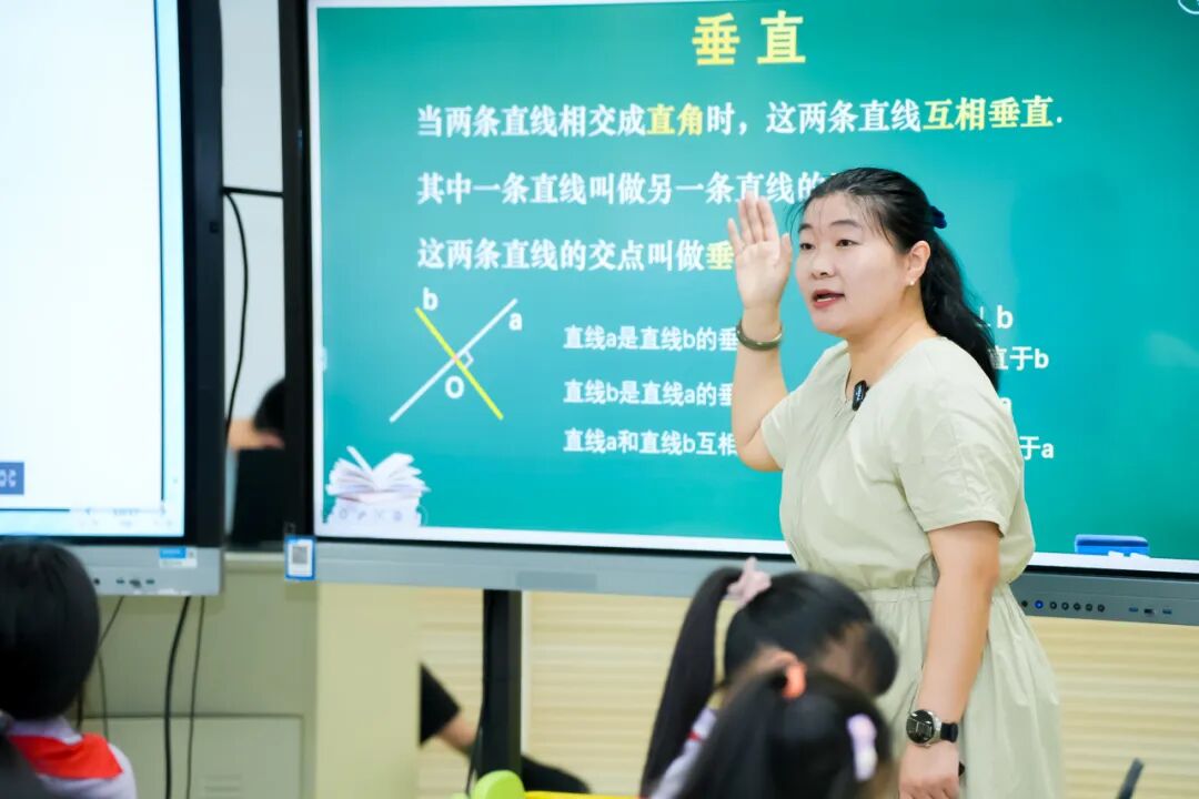 马陆小学刘老师执教四年级数学下册第四单元几何小实践-垂直,刘老师采用“生活化情境+数字化互动”的教学模式,以学校周边地图场景引入,引导学生找出相交的两条马路,逐步过渡到两条直线相交成直角时,这两条直线互相垂直。借助平板电脑的实时互动功能,学生能够直观看到操作结果,有效建立起具体操作与抽象概念之间的联系。