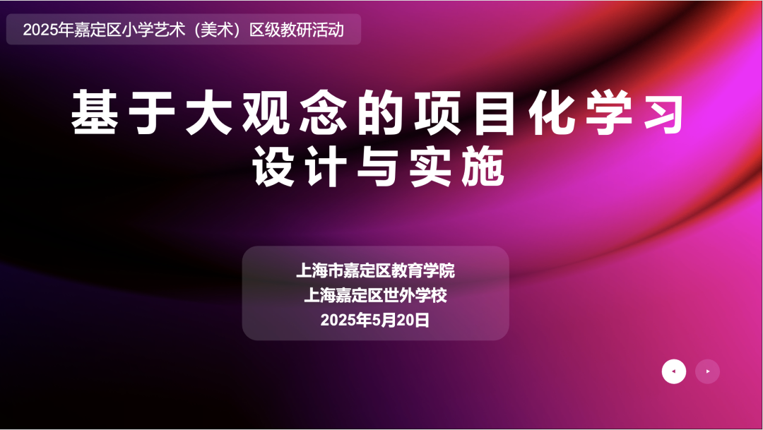 5月20日下午,以“基于大观念的项目化学习设计与实施”为主题的嘉定区小学美术教研活动在上海嘉定区世外学校成功举办。嘉定区“综合课程创造力项目”专家刘侃博士、区教育学院小学艺术(美术)教研员戴春莉、课程部刘楚、嘉定世外校长朱萍、副校长关早立、学科项目化领衔校普通小学白银路分校副校长韩乘乘、全区小学美术教研组长、五年内青年教师、戴春莉小学美术名师工作室成员等参加了此次活动。活动由嘉定世外田迎春主持。