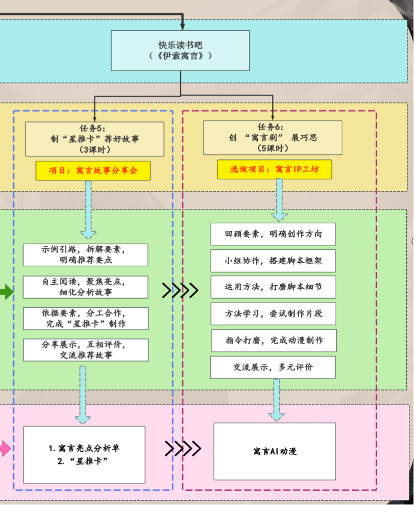 案例分享 普通小学白银路分校胡咪进行“海岸单元科普剧的AI创作设计”案例分享。围绕四年级第一学期自然“海岸”单元,聚焦“生物与环境的相互关系”这一核心概念递进任务。单元核心任务“海岸‘科普’创编营”以项目化形式展开,围绕“构思→创作→评价”为主线展开。基于“使用AI创作反映‘动植物适应海岸环境变化’科普剧及连环画任务”项目,学生讨论明确海岸类型、拆解剧本要素,运用AI进行信息搜索、撰写、优化科普剧本并转化为科普连环画。最后,小组布展作品并介绍,最终打磨出优质的海岸科普剧剧本。 同济大学附属实验小学王喆、毕婷婷进行“如何设计一种公平、高效的赛制”案例分享。案例围绕数学四年级《计算比赛场次》单元,聚焦“体育比赛中的搭配问题”核心概念设计递进任务。“设计混合赛制”这一任务以项目化形式展开,遵循“明确标准—合作设计—展示互评”的流程。结合赛制特点,以“设计一种公平、高效的赛制”为任务驱动,学生兼顾公平性、高效性和可操作性三个维度,合作设计公平高效赛制方案。通过小组合作手绘流程图或实物演示的方式,介绍设计思路。依据评价维度表选出适配学校班班赛的赛制方案。 上海同济黄渡小学金珏进行“寓言中的智慧”案例分享。此案例以统编版语文教材三年级下册第二单元 “读懂寓言故事的道理” 为核心,围绕 “基于矛盾冲突的寓言解读与创意表达”, 基于“递进任务 + 项目驱动 + AI 赋能 + 成果评价” 的项目化设计逻辑,设计借“结构图”理情节、用“对比镜”析冲突等六个递进任务,引导学生从 “读懂寓言” 到 “创享寓言”,实现 “阅读输入—思维深化—创意输出” 的完整学习闭环。“寓言IP工坊”这一任务以“寓言是如何通过简单的故事去传达深刻的道理的?”为本质问题,以“制作AI寓言动漫”为核心任务,以 “调研—创作—展示”为主线,学生在完成寓言故事分享之后,一部分学生参与社团活动的学生,最终完成一个寓言AI动漫。 交通大学附属嘉定实验学校冯舒怡进行“传统文化里的汉字”案例分享。案例围绕统编版语文教材二年级下册第三单元“传统文化里的汉字”开展单元设计。团队创设了“传统文化推荐官”单元情境,设计学习任务,帮助学生依次感受祖国的地理特点、汉字历史及饮食文化,在传统文化学习中培养自主识字的能力。“探索节中美食,发现‘食’中字趣”这一任务融入学科项目化设计,承接前两个任务学习,将对偏旁归类与识字方法的认识迁移到饮食文化中,完成节日菜单的设计,形成“感知—理解—运用”的学习闭环,实现从汉字学习到文化实践的落地。