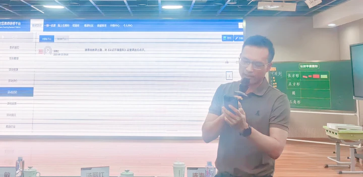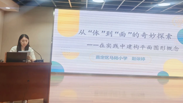 经验分享: 从 “体” 到 “面” 的教学密码 精彩课例背后,是团队的深耕细作。课后,马陆小学赵依婷老师带来主题为《从“体”到“面”的奇妙探索——在实践中建构平面图形概念》的教研组经验分享。赵老师结合教学实例,从教学设计的理念、学生学习过程中的难点突破以及实践活动的组织策略等方面,详细解读了如何引导一年级学生完成这次“奇妙探索”,分享了团队在帮助学生建构平面图形概念过程中的具体做法与深刻反思,为在场教师提供了可借鉴的实践案例。