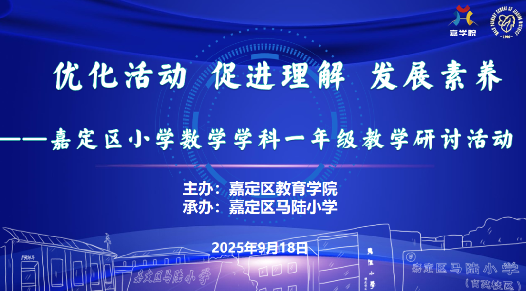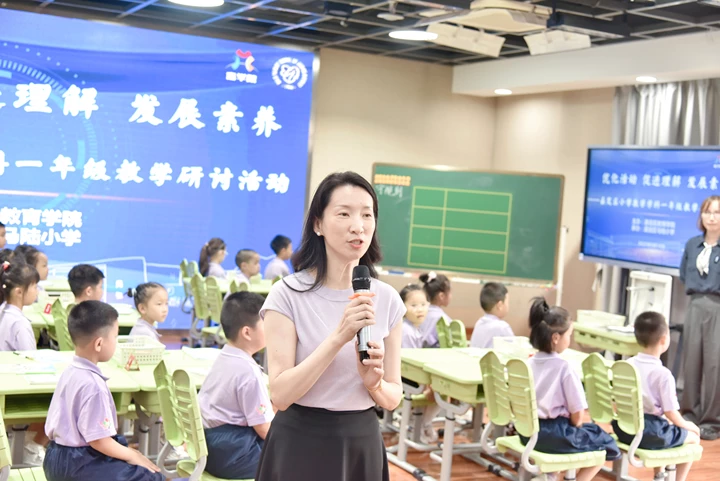 2025年9月18日下午,由嘉定区教育学院主办、马陆小学承办的“优化活动 促进理解 发展素养”嘉定区小学数学一年级教学研讨活动在马陆小学顺利开展。本次活动聚焦新课标理念下一年级数学课堂教学小幼衔接的优化路径,旨在通过课例展示、经验交流、互动研讨与专家引领,推动教师在活动设计与素养培育方面的专业提升。上海市特级教师、上海市小学数学教研员章敏,嘉定区马陆小学书记、校长朱英,嘉定区小学数学教研员汤丽红、陈海锋,以及全区一年级数学任课教师,暑期课程班学员齐聚一堂,共探教学策略,共谋素养落地。