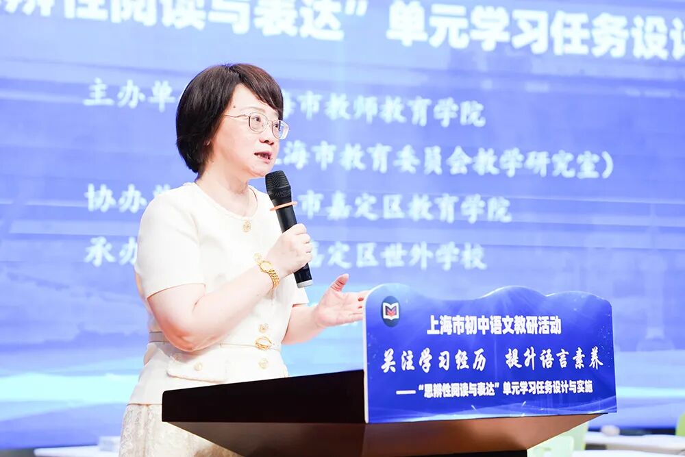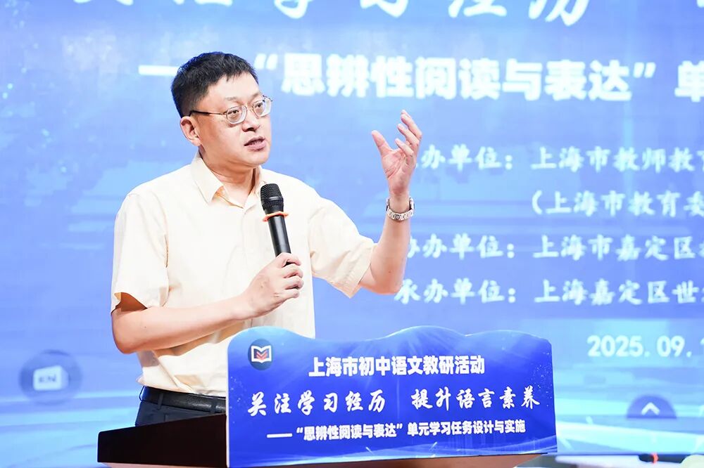 2025年9月18日下午,主题为“关注学习经历,提升语言素养——‘思辨性阅读与表达’单元学习任务设计与实施”的上海市初中语文教研活动在上海嘉定区世外学校举行。活动由上海市教师教育学院(上海市教育委员会教学研究室)主办,上海市嘉定区教育学院承办,上海嘉定区世外学校协办。活动线上线下同步进行。上海市初中语文教研员曹刚、普陀区教育学院副院长缪亚男、嘉定区教育学院副院长汤杰、上海嘉定区世外学校校长朱萍、各区初中语文教研员及骨干教师参加现场活动,上海市全体初中语文教师线上观摩。活动由嘉定区初中语文教研员孙凤主持。