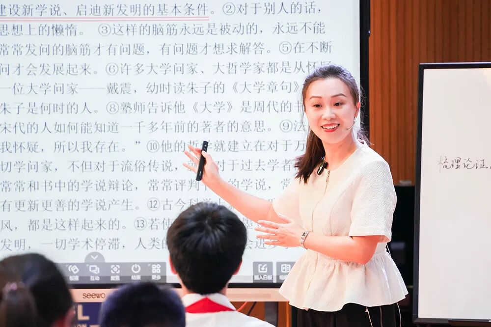 嘉定区初中语文教研员姚婧媛执教《怀疑与学问》一课。她首先结合单元目标,明确梳理论证思路的重要性,引出学习任务,聚焦文章第6段展开教学。通过引导学生梳理DeepSeek的思考过程和结果,与自己的思考步骤进行比对,同时借助“三个助手”平台呈现学习成果。最终,通过作业引导学生迁移巩固课堂所学。