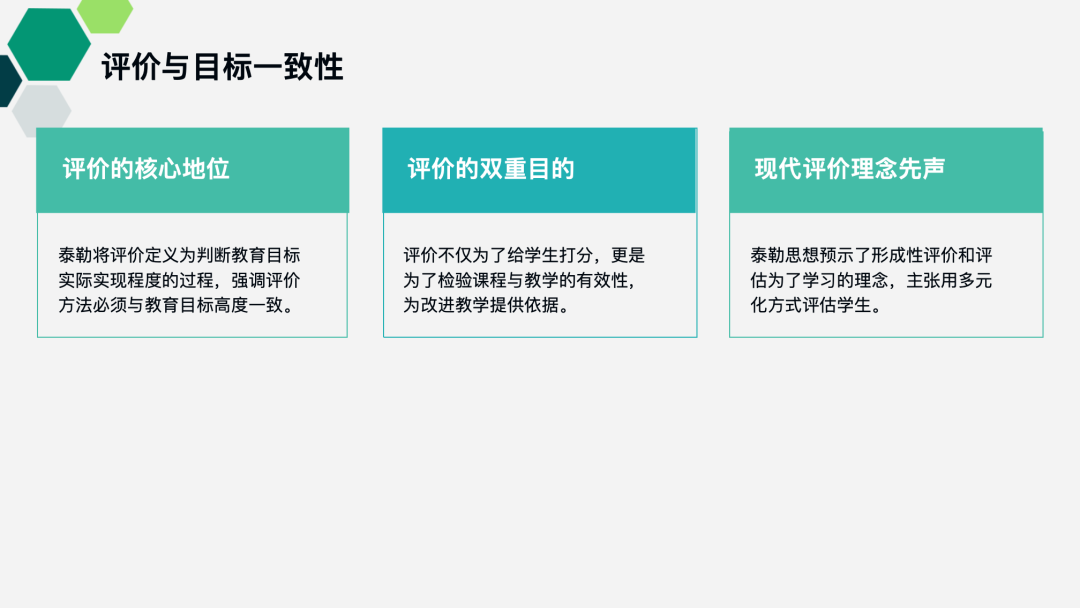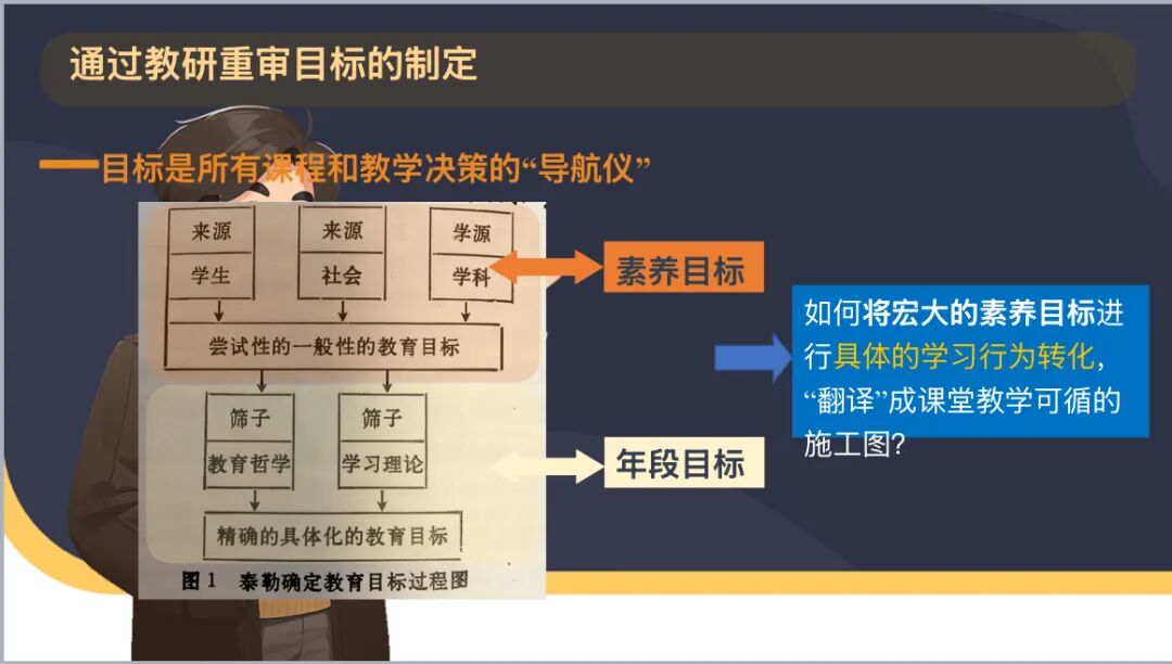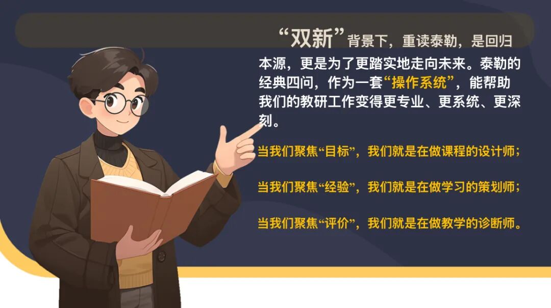 教研员张霞老师,则从更深层的价值维度解读泰勒原理。她强调,原理的核心在于确立教育目标的先导性——目标需从学习者、校外生活、学科专家建议中汲取养分,再经哲学与心理学的筛选沉淀;其革新之处在于重塑评价理念,让评价不再是 “终点裁判”,而是服务教学改进的“全程导航”;更难得的是,这一框架始终保持开放与中立,既能适配基础能力培养,也能支撑高阶素养发展,即便在当下,仍是教育者反思实践、校准方向的重要指引。