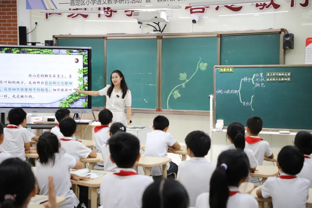 教学展示环节,嘉定区新城实验小学邢乐琰老师首先执教《爬山虎的脚》第二课时。邢老师紧扣“连续观察”这一单元主题,引导学生从文本中提取关键信息,体会作者连续细致的观察与准确生动的表达。通过资料卡、图文结合、动作演示等多种方式,学生不仅理解了爬山虎“脚”的样子及爬墙过程,更在潜移默化中习得了“从观察到表达”的写作路径,实现了阅读与写作的有效链接。 随后,嘉定区新城实验小学周燕华老师呈现了一节习作指导课《写观察日记》。周老师巧妙衔接前课所学,引入“豆包”数字助手,引导学生将观察记录转化为结构完整、内容具体的观察日记。学生通过对比阅读、范例点评、同伴互评等活动,在实践中巩固了“观察—记录—表达”的写作流程,实现了从阅读输入到写作输出的自然过渡。