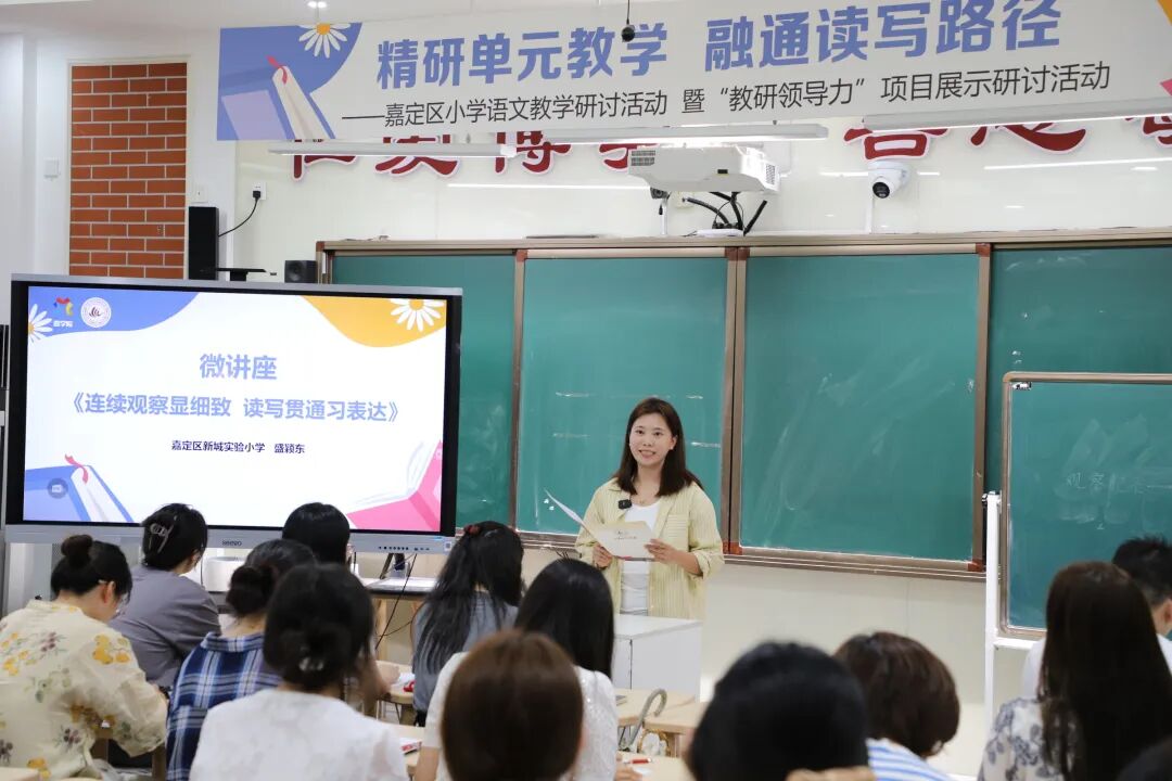 交流研讨环节,嘉定区新城实验小学盛颖东老师围绕“连续观察显细致,读写贯通习表达”这一主题,从单元教材解读、单元教学规划及单元读写策略三方面,介绍了本单元的教学路径与实施框架,分享如何在教学中建立“观察”与“表达”的有机关联,促进学生读写能力的整体发展,为与会教师提供了可借鉴的教学思路。
