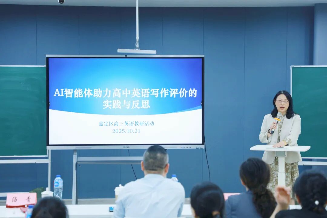 2025年10月21日下午,以“AI智能体助力高中英语写作评价的实践与反思”为主题的高中英语教研活动在上海市嘉定区第二中学成功举办。上海市教师教育学院中学教师部部长汤青老师、上海市嘉定区第二中学校长宋保平、嘉定区教育学院副院长秦惠康、上海市嘉定区第二中学副校长胡冰、嘉定区高中英语教研员孙饴参与此次联合教研活动。活动由嘉定区高中英语教研员司南老师主持。