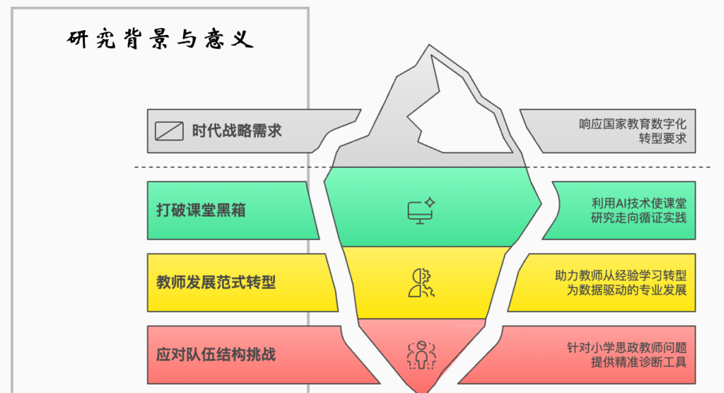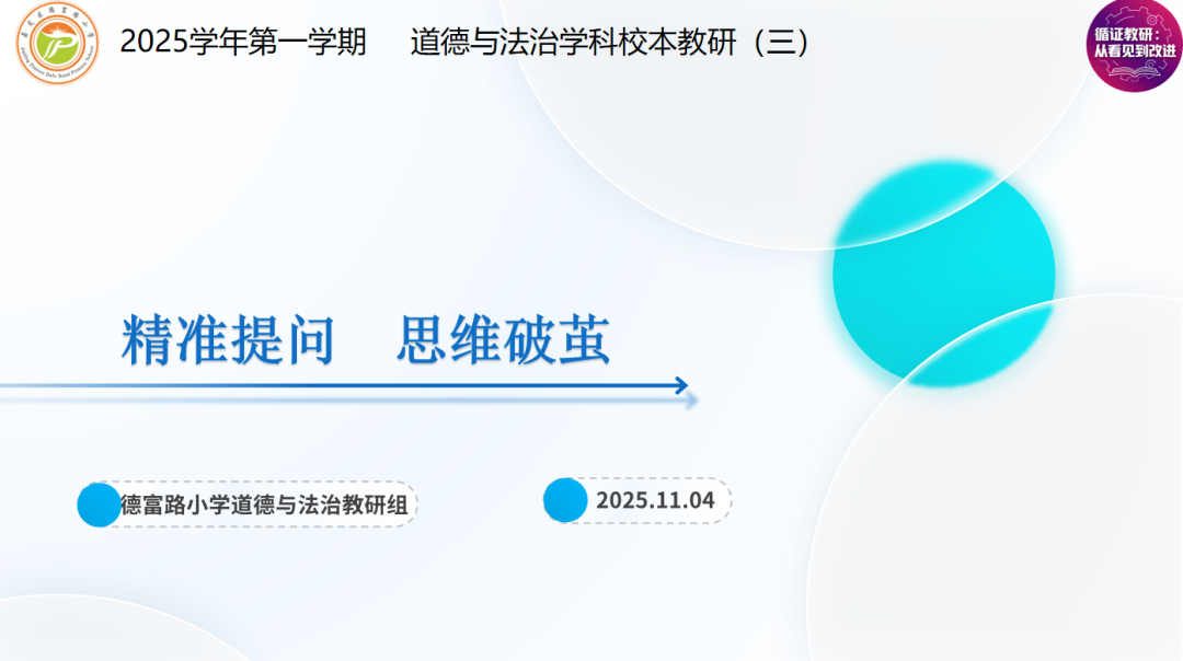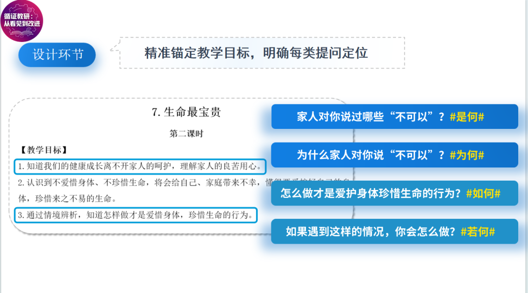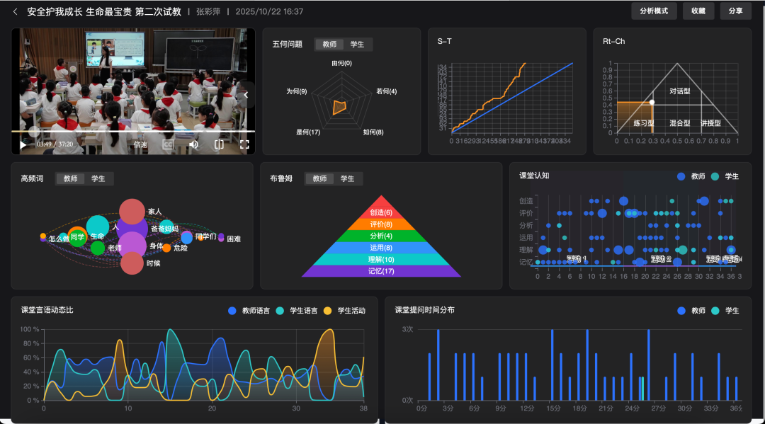 区级领航 构建数据驱动的教研新生态 嘉定区小学道德与法治教研员赵明珠围绕理论奠基、问题诊断、路径构建、循证实践与下阶段重点等方面作课题中期汇报。她指出,本次研究以“智能工具为眼、循证逻辑为径”为基本理念,通过文献研究确立“从经验走向循证”的教研转型理论基础;依托覆盖全区1048名教师的大样本问卷,精准刻画思政教师队伍“兼任比例高、新手教师多”等结构性特征,锚定AI赋能的现实起点。在此基础上,团队深度整合智能课堂分析平台的“五学”模型与154项多模态指标,初步构建“数据采集—问题定位—策略生成—实践验证”的课堂改进闭环,并创新形成“一人一课多磨”与“多人一课比较”双轨并行的校本教研路径。通过多个覆盖不同发展阶段教师的典型课例迭代,实证了AI数据在驱动精准提问、优化互动结构、显化思维过程等方面的关键作用,有效推动教学诊断从经验模糊走向数据精准。下一阶段,课题组将聚焦核心指标筛选、分类诊断框架构建与人机协同模式推广三大任务,着力研制《小学思政教师课堂智能分析核心指标集》与《分类诊断评估框架》,为区域教师专业发展提供可操作、可复制的循证教研新范式。 校本深耕 呈现“精准提问”的循证闭环 为将区域课题研究成果转化为校本实践动能,德富路小学道德与法治教研团队带来题为“精准提问,思维破茧”的现场教研展示。团队以《生命最宝贵》课例为载体,依托智能课堂分析平台,对两轮试教的“五何问题”分布、学生高频词、追问类型等数据进行深度剖析。通过“数据说话—策略迭代—共识提炼”的全过程,生动演绎了校本教研如何借助循证工具,实现从“看见教学”到“改进教学”的实质性跨越。