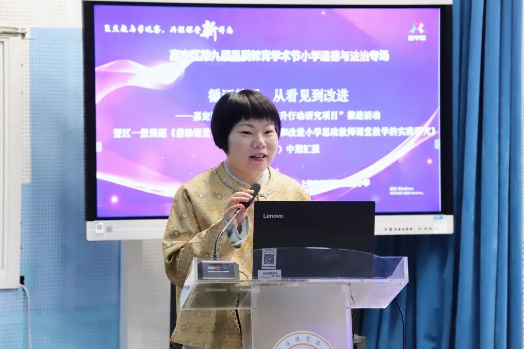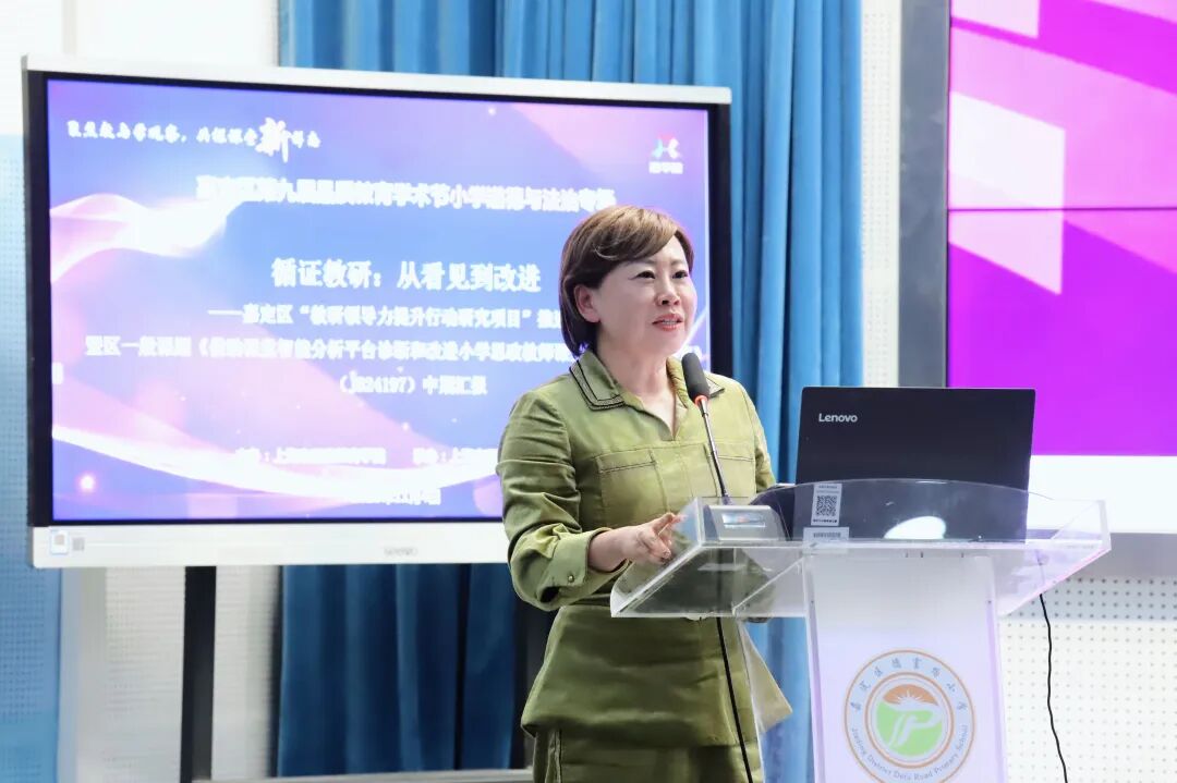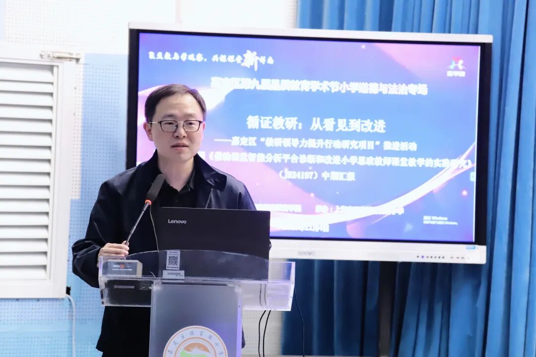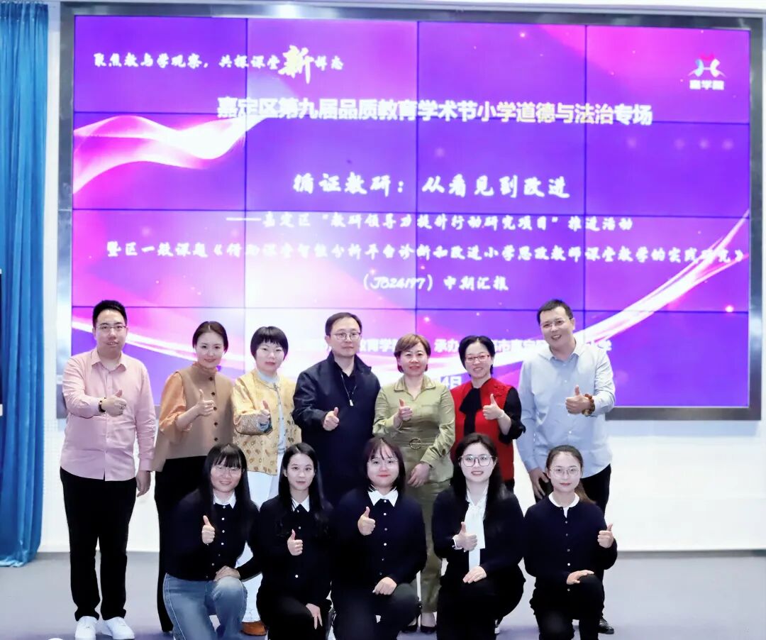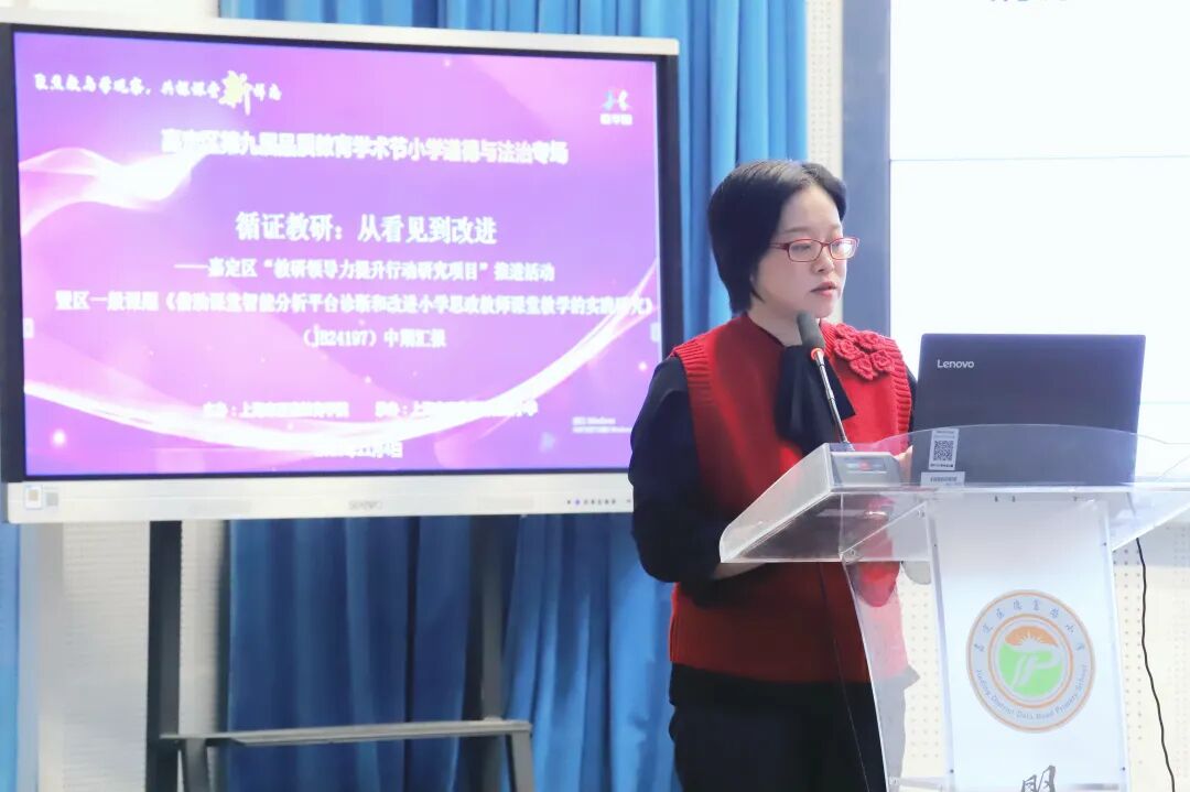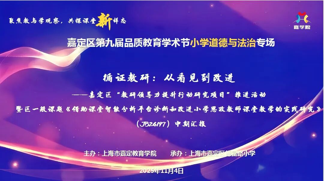 为深化教育数字化转型背景下教研范式变革,推动区域教研从“经验驱动”迈向“数据驱动”,2025年11月4日下午,嘉定区小学道德与法治“教研领导力提升行动研究项目”推进活动暨区级一般课题《借助课堂智能分析平台诊断和改进小学思政教师课堂教学的实践研究》(JB24197)中期汇报在嘉定区德富路小学举行。本次活动作为嘉定区第九届品质教育学术节小学道德与法治专场,特邀嘉定区教育学院副院长秦惠康,上海市特级校长花洁,宝山区托幼服务指导中心主任、原宝山区教育学院道法学科教研员毛志峰,上海市未来学习与研究发展中心课堂循证实验室秘书长陆海卫莅临指导。活动由嘉定区教育学院科研室科研员何彦雨主持。区小学道德与法治学科中心组成员、各小学道德与法治教研组长共同参与活动。