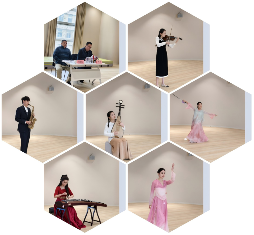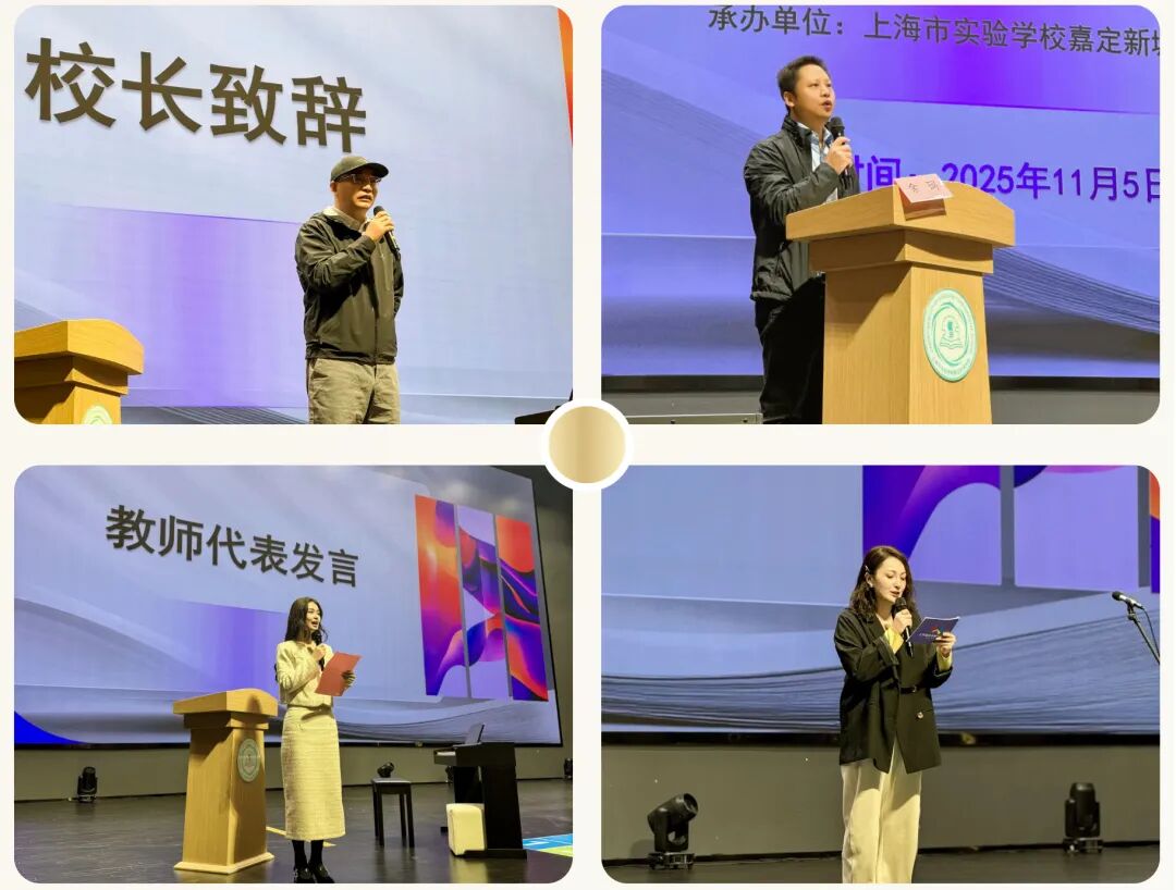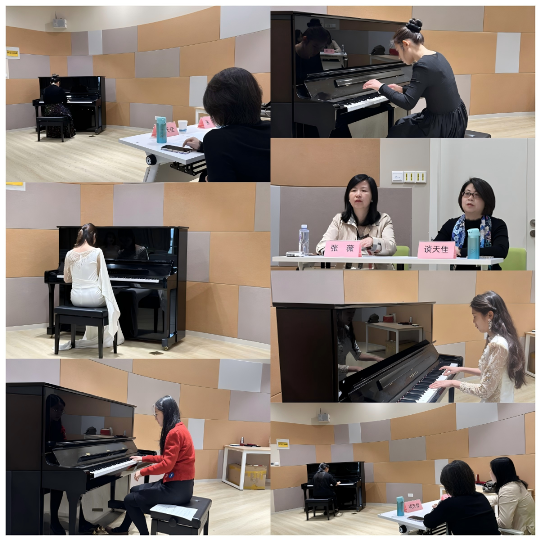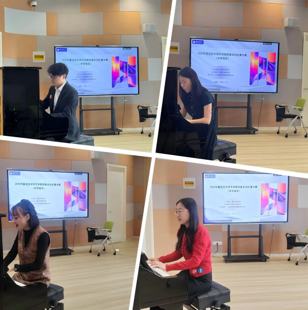 音乐专场: 多元竞技显功底 美育初心铸师魂 音乐专场以“一专多能、以赛促优”为核心,构建起科学规范的“分层选拔、全员覆盖” 赛事体系。初赛于 6 月正式启动,紧扣课堂教学应用需求,聚焦弹唱指挥、第二特长、钢琴、声乐四大专项,多场并行赛场高效有序。由区中学音乐学科教研员、中心组成员组成的评审团,以专业标准严格评定,从新城教育集团、南翔学区、安亭学区、迎园教育集团等多个赛区中,选拔出一批专业素养佳的教师晋级区级决赛。 11 月 5 日的决赛现场氛围热烈而庄重。开幕式上,上海市实验学校嘉定新城分校郑杰校长致辞,既饱含对美育工作的深厚情怀,也寄予了对参赛教师的殷切期望;上海市嘉定区青少年活动中心余珂副主任发表讲话,为赛事明确方向、增添动力。现场还详细介绍了由本市音乐艺术领域资深专家组成的评审团,并对比赛规则、评分维度、展示时长及赛场纪律作出明确说明,确保赛事公平公正、高效有序开展。 教师们以扎实的专业功底,饱满的精神态度,呈现自身多元综合的艺术素养。评审环节,各赛场的评委们都给予了赞赏和鼓励,并提出中肯的建议。他们充分肯定了教师们的亮眼表现,称赞教师们在演唱技巧、台风气质、服装搭配等方面尽显高水准的专业素养与审美能力,在繁重的日常教学任务下仍能维持如此出色的艺术表现,难能可贵;同时也提出殷切期望,希望教师们未来能选择更贴合自身特质的作品,注重咬字清晰与音准节奏的精准训练,持续打磨技艺,不断提升艺术表现力。