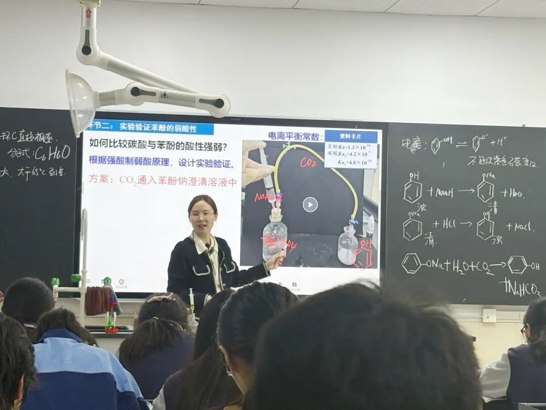 一、情境创设: 从生活小切到社会担当的深度思考 活动在两节精心设计的公开课中拉开帷幕。珠峰中学须奕航老师执教的《液态阳光工程——以二氧化碳为原料工业合成甲醇》一课,以全球关注的“碳中和”议题为切入点,创设了极具时代感的工程情境。课堂上,学生化身“绿色能源工程师”,在AI数字人的辅助下,经历从反应原理探究到工艺流程设计的完整工程思维训练。这节课生动的融合科学、技术、工程与数学,彰显了“情境赋能、跨界融合”的课堂新貌。 周静老师执教的《苯酚》一课,则从学生熟悉的生活场景出发,以退烧药、藏香、茶叶水等日常物品引入酚类物质,瞬间拉近了化学与生活的距离。课堂通过精心设计的系列探究实验,引导学生从“结构—性质—用途”的化学学科思维角度深入理解苯酚特性。更值得称道的是,周老师将李斯特发现苯酚消毒作用的历史典故自然融入教学,在传授知识的同时,培养了学生的科学精神和人文素养。课堂贯穿化学史与环保议题,注重证据推理与模型认知,在“动手做”与“动脑想”中激发学生科学思维,体现“实验探理、价值引领”的育人理念。 二、专业引领: 从教学到育人的理念升华