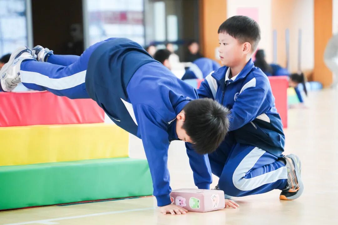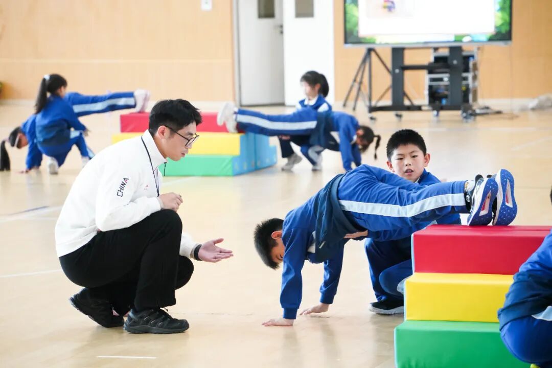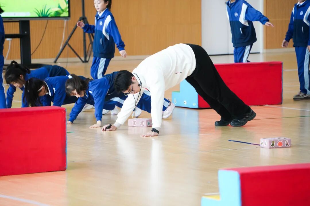张鹏老师执教了二年级《移动性技能:支撑移动/6-5》。张老师以“自然探险队”为主题情境,通过“陡坡挑战”“鳄口逃生”“环形石阵”等富有童趣的任务设计,引导学生在不同高度和路径的支撑移动中掌握重心控制与手脚协调。课堂贯彻“学练赛”一体化理念,注重分层教学与同伴互助,有效发展了学生的上肢力量、核心稳定性与身体控制能力,凸显移动性技能 “分层递进、情境化习得” 的特征。