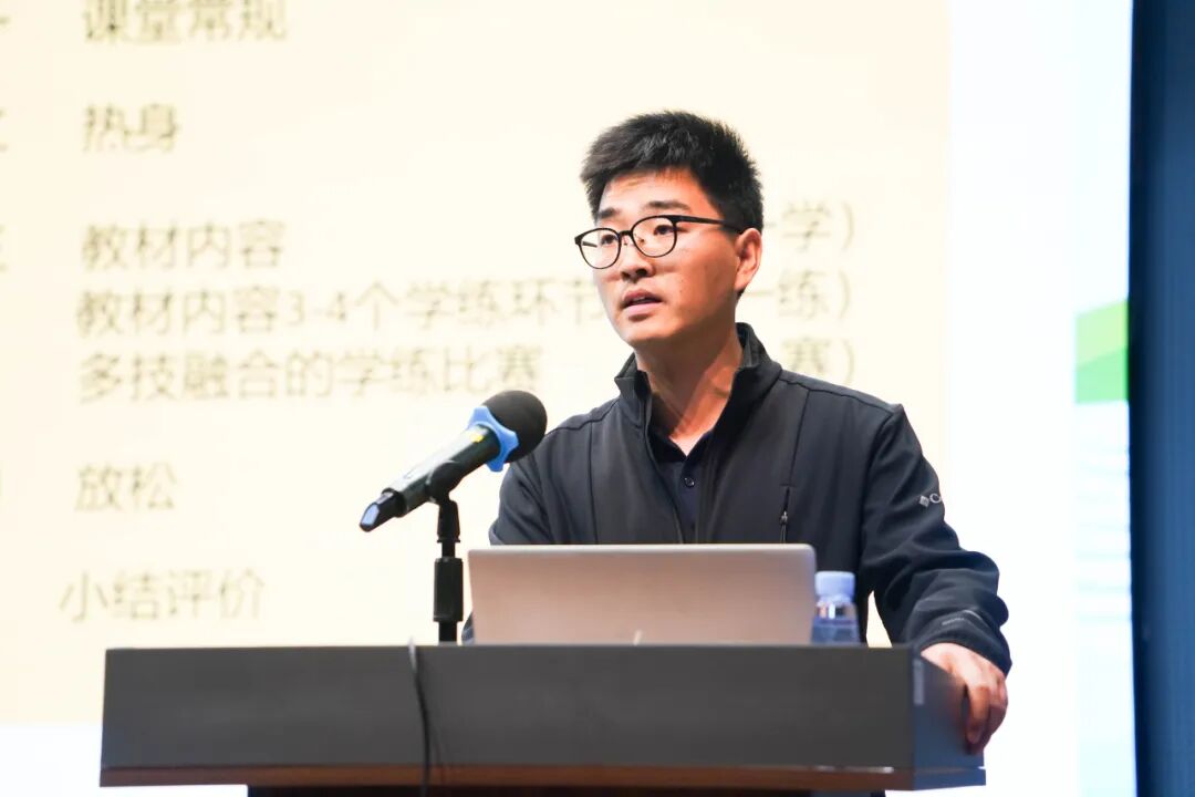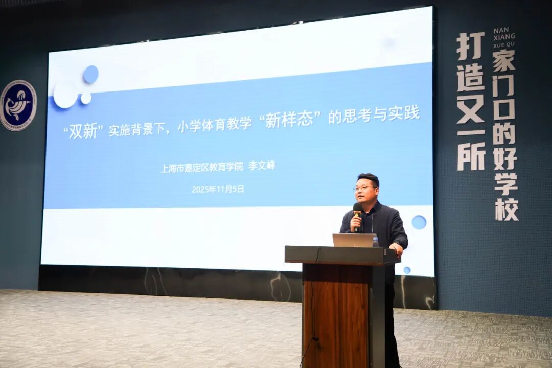 嘉定区教育学院小学体育教研员李文峰老师作《“双新” 实施背景下,小学体育教学 “新样态” 的思考与实践》主旨报告。李老师从“双新”推进出发,提出“新样态”应该是一个充满活力的教育改革前沿概念,它旨在符合新时代要求、更新传统模式、注重育人实效和有效培育素养,并从新教材学习与实施、教师专业技能提升、课堂教学效率提升、学生体质及综合素养提升四个方面详尽阐述了推进“双新”过程中,体育教育教学呈现的出的“新样态”。