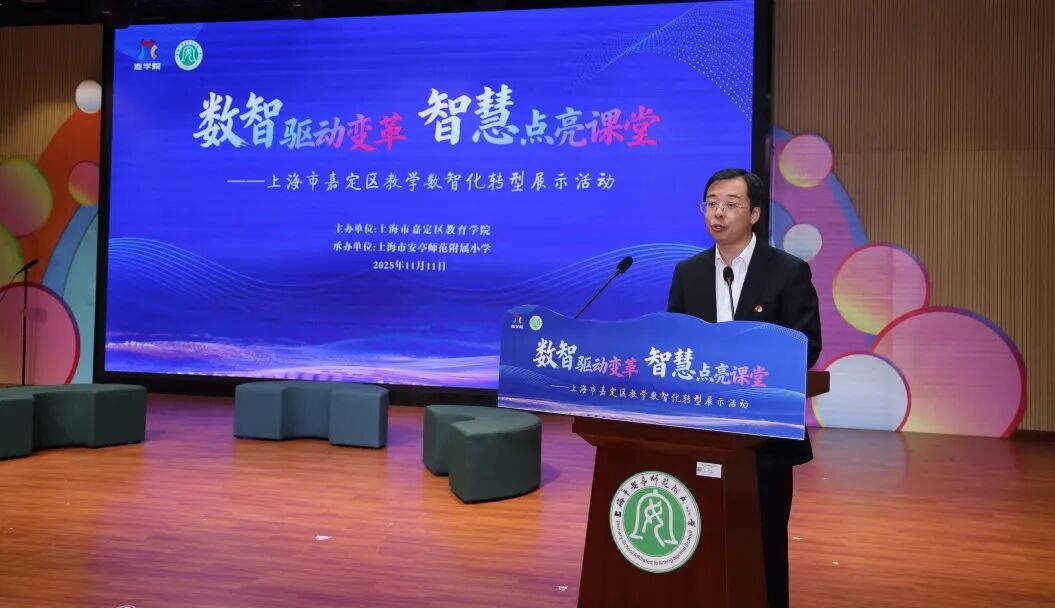 2025年11月11日下午,以“数智驱动变革 智慧点亮课堂”为主题的嘉定区教学数智化转型区级展示活动在上海市安亭师范附属小学开展。上海市教师教育学院(上海市教委教研室)综合教研员、上海市中小学教学数字化转型总项目组成员周杰、嘉定区教育学院小学语文教研员张艳、小学数学教研员陈春芳、小学英语教研员袁勇浩、小学科学教研员陈健、小学综合实践活动课程教研员、区教学数智化转型项目负责人邵红霞、安亭学区部分小学校长、安师附小党支部书记、校长朱英出席活动。