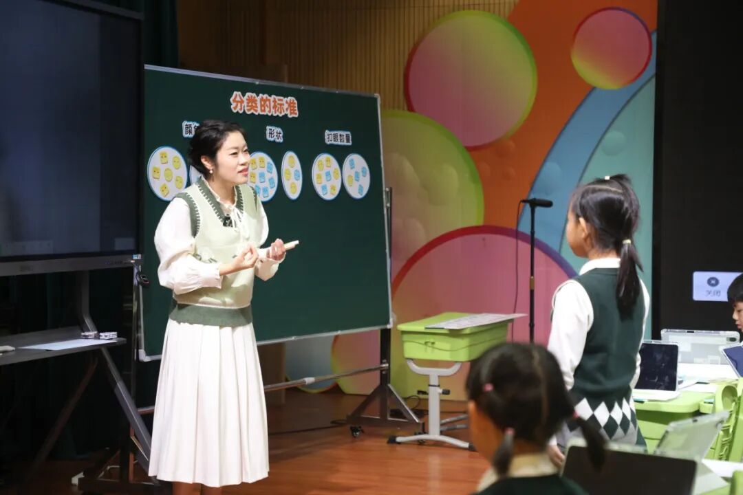 安师附小数学学科教师常思铭执教二年级《分类的标准》。常老师以“分扣子”等实践活动为载体,将数智技术融入教学。学生通过平板操作探索分类标准、记录结果,培养数据意识与应用能力。安师附小数学学科教师朱晓亮主持分会场活动,安师附小数学学科教师姚甘悦进行教学设计说明。陈春芳充分肯定本节课运用数智技术在教学活动开展与目标达成上的显著成效,并从任务设计的实践性、技术适配的年级特性、数据意识培养的精准性展开专业指导。