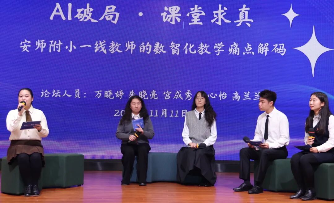 以“AI破局 课堂求真”为主题,学校课程教学部主任万晓婷与朱晓亮、宫成秀、毛心怡、高兰兰四位教师一道,回顾对数智化教学痛点的解码过程,介绍如何用技术破解“差异化教学”“评价证据缺失”“数学算理难”“英语开口难”等难题。