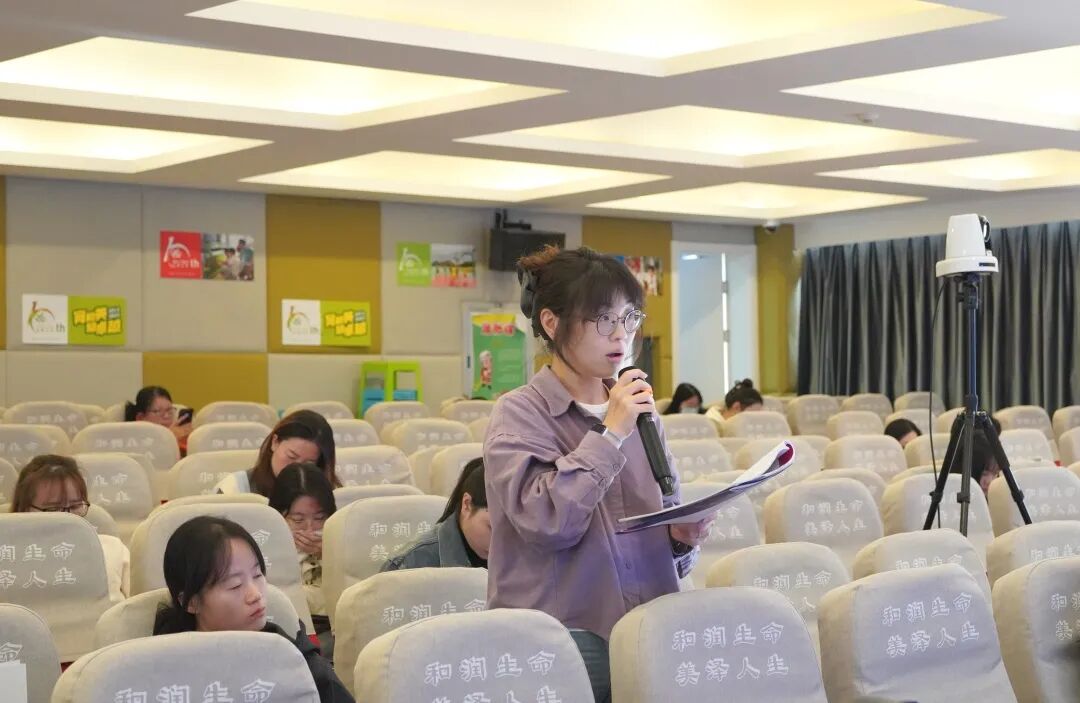 02 互动研讨凝智慧,思维碰撞促提升 互动研讨环节,上海大学附属嘉定留云小学王奕萍老师与城中路小学徐渊老师聚焦本次教研的核心议题发表了深刻的见解。 王奕萍老师认为赵薇老师的课堂以真实任务驱动为主线,通过分层实践与多元工具支持,有效促进了学生的技能习得与素养提升。马小媛老师则通过创设真实情境引导学生开展社会调查,从实际需求出发进行创新思考,并借助膳食指南、AI建议等学习支架,将复杂的教学难点分解为可操作的步骤,体现了教师出色的教学设计能力。 徐渊老师认为素养培育的长远性与有效学习的即时性在两位老师的课堂中得到了很好的平衡。赵老师通过“首印—二印”的递进式任务链,推动学生在实践中内化技能。马老师则以“调查—设计—优化—AI助力”的完整流程,实现了学生从基础技能掌握到创新素养提升的跨越。两位老师的教学设计与支架运用策略,为在场的校本课程老师提供了宝贵的借鉴。