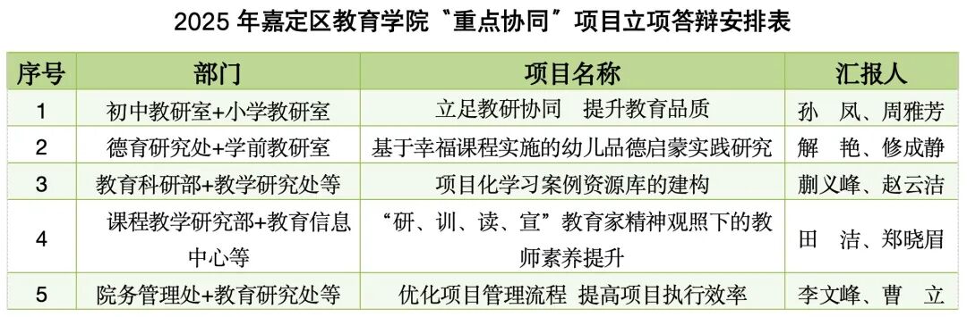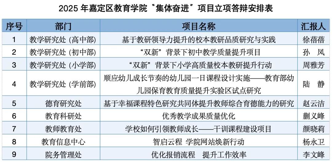 嘉定区教育学院自2020年以来通过“集体奋进项目”和“重点工作协同项目”推动教育综合改革的持续深耕。项目内容逐年深化,从最初的摸索尝试到如今的突破创新,不断为学院发展注入新动力。2月26日,学院举办了2025年集体奋进、重点协同项目立项申报答辩会。此次会议旨在进一步推进学院内涵发展,提升教育品质,通过项目引领驱动学院及区域教育的深度变革。会议邀请了上海市教科院党委书记祝郁、上海市浦东教育发展研究院原院长顾志跃、普陀区教育学院原院长杨杰担任评审专家。院长许晓芳,副院长丁馨、秦惠康、汤杰,工会主席孙惠东及全体中层干部、项目主要负责人出席会议,会议由丁馨副院长主持。