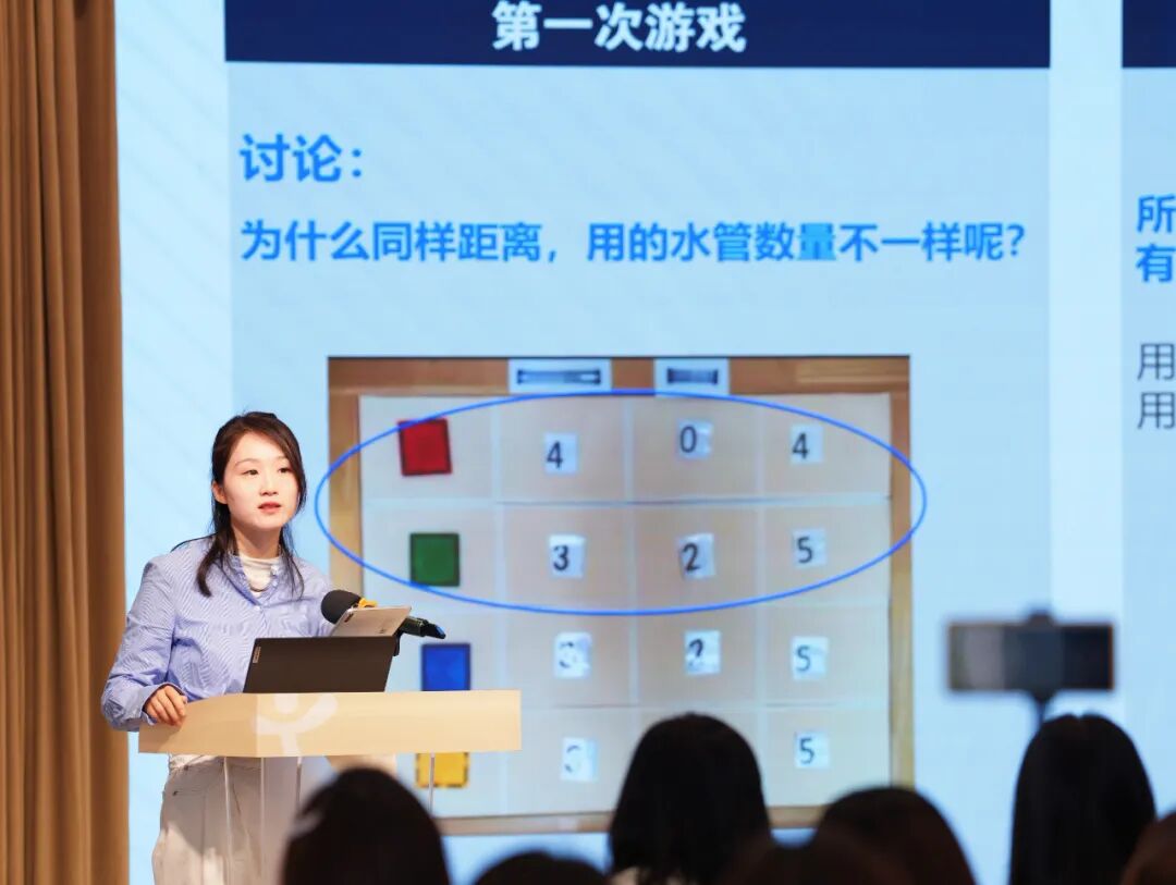 新城实验幼儿园沈艳皎分享《基于幼儿经验联结的数学高低结构活动的设计——以大班数学活动“接水管”为例》的案例,生动呈现教师如何捕捉幼儿自主探索中的“真问题”——从水管拼接的失败经验出发,通过“观察辨析、聚焦需求、经验联结、持续观察”的方式将零散的游戏行为转化为幼儿高低结构经验链接的学习内容。